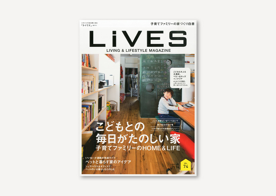 1.8M WIDTH HOUSE was featured in “LiVES”, a housing and interior magazine published by Magazine House. In the feature article, “Ideas for Living with Pets,” you can catch a glimpse of our spontaneous life with our two beloved cats.