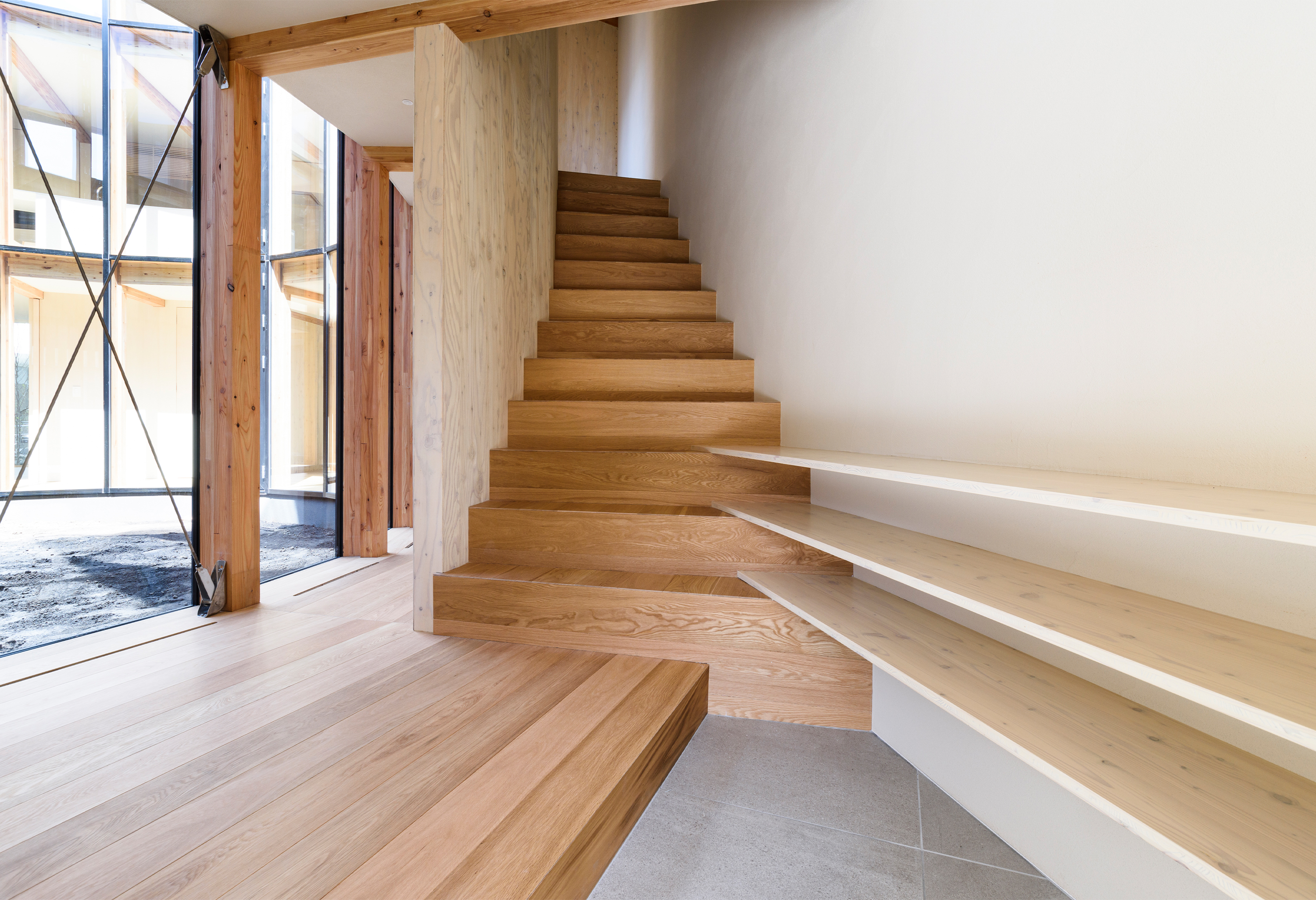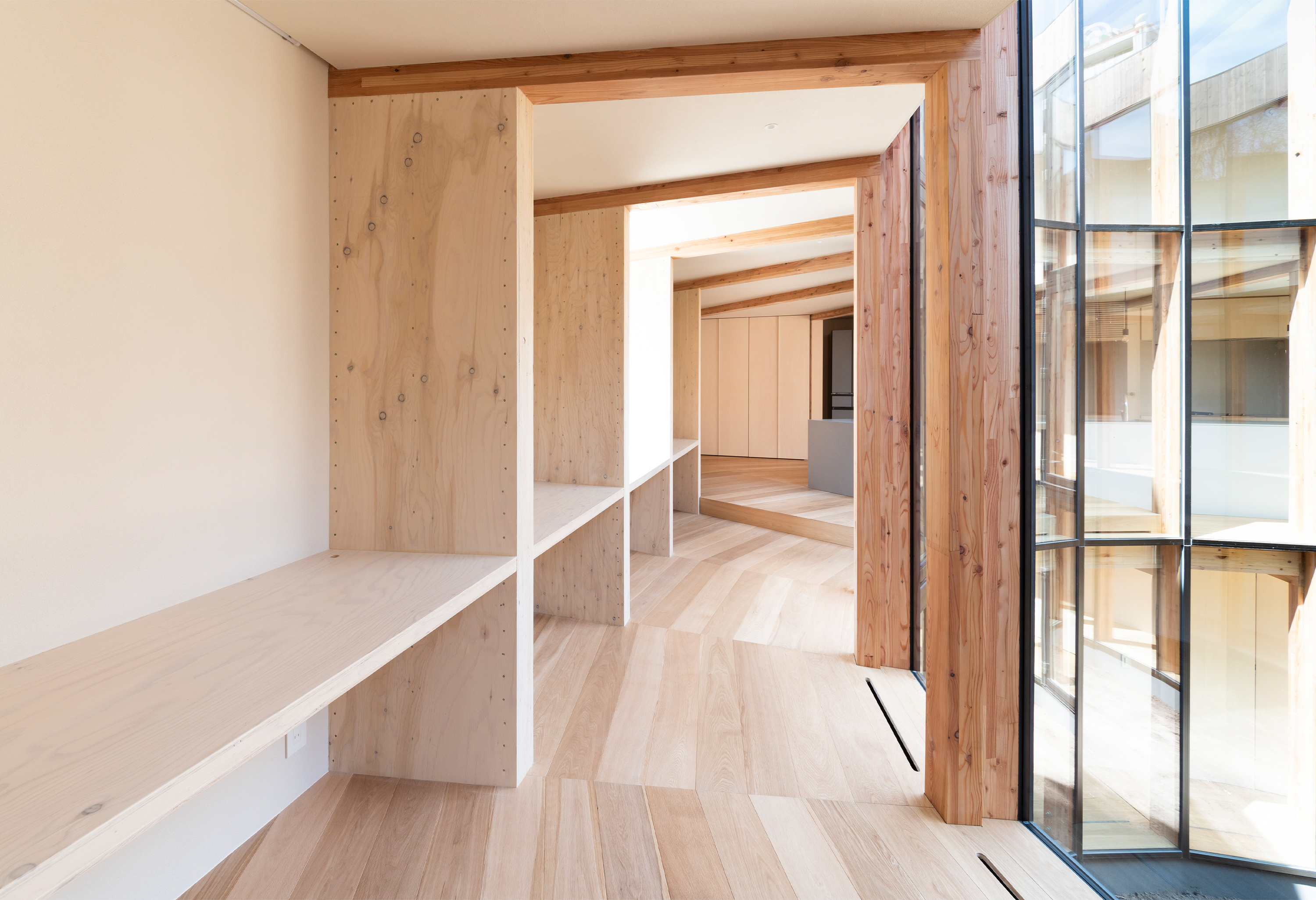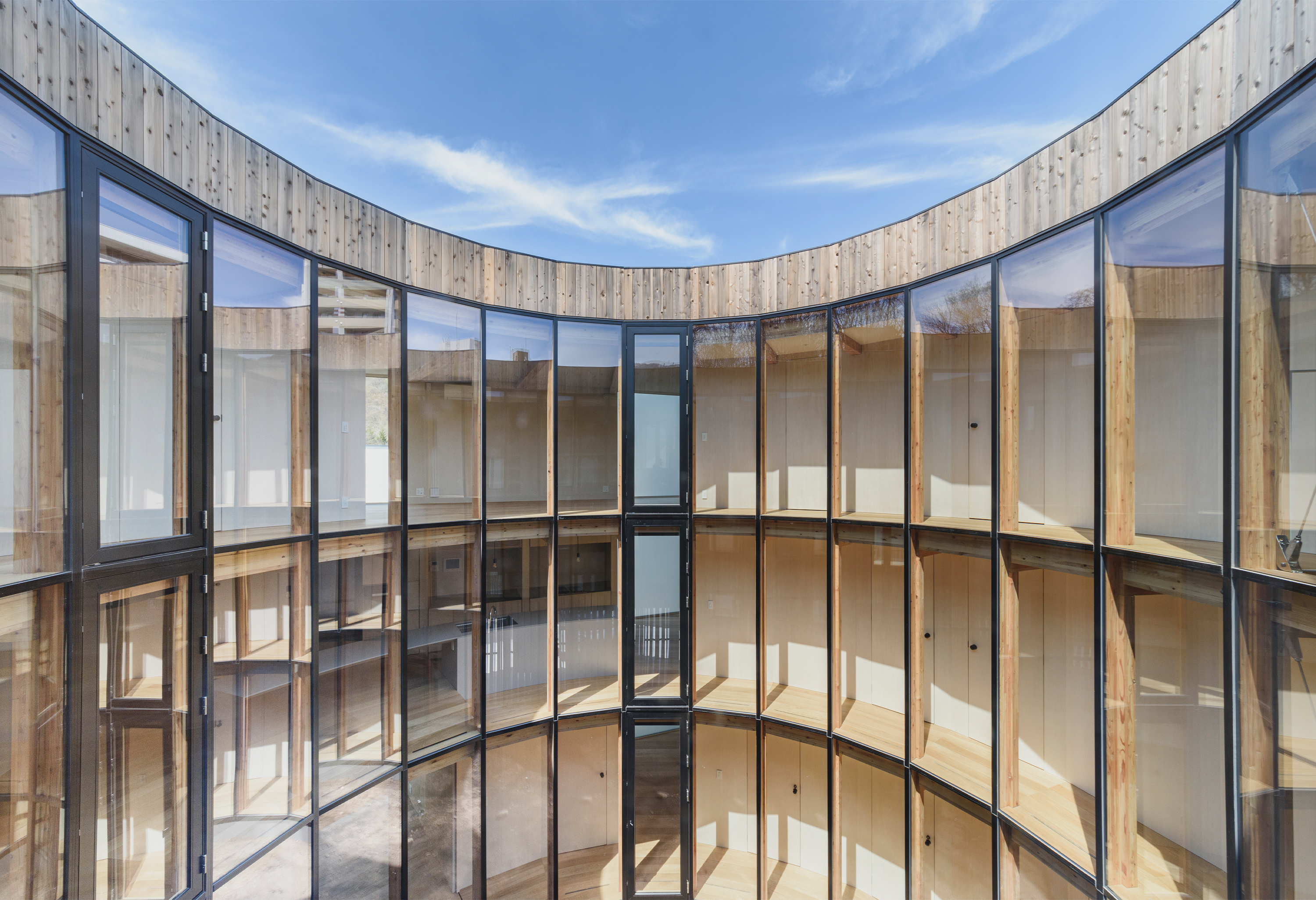 Apart from light, the courtyard provides the dweller with more natural spectacles. As Sapporo is located in the northernmost region of Japan it faces bitter winters and heavy snow fall on a yearly basis. The circular courtyard invites the weather into the living space whilst keeping the dwellers’ warm and comfortable, temporarily creating the effect of living inside a snow globe. Meanwhile the private quarters face the forested hills surrounding the residence, offering the dwellers scenic views of the landscape and anchoring the building in its surroundings.