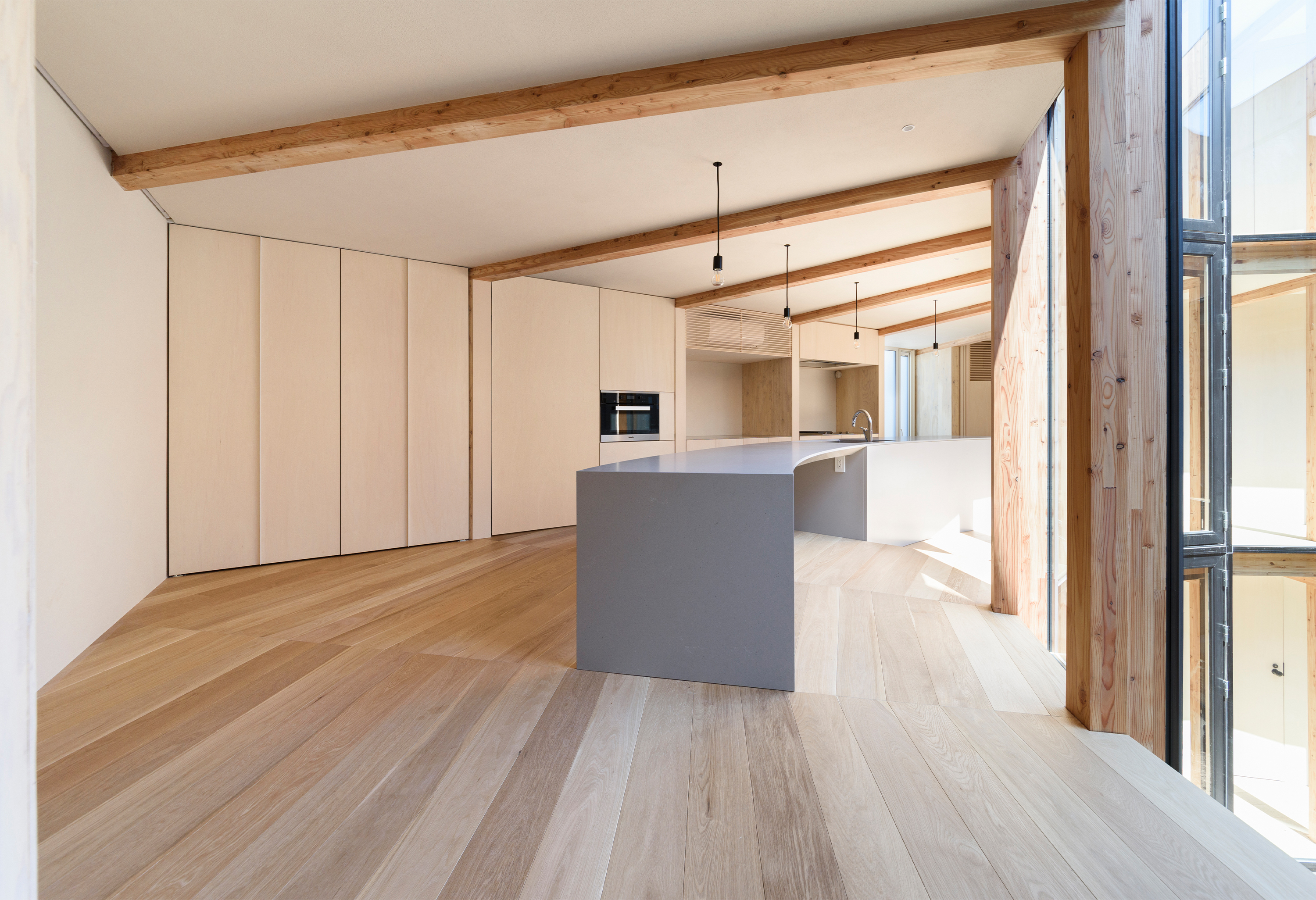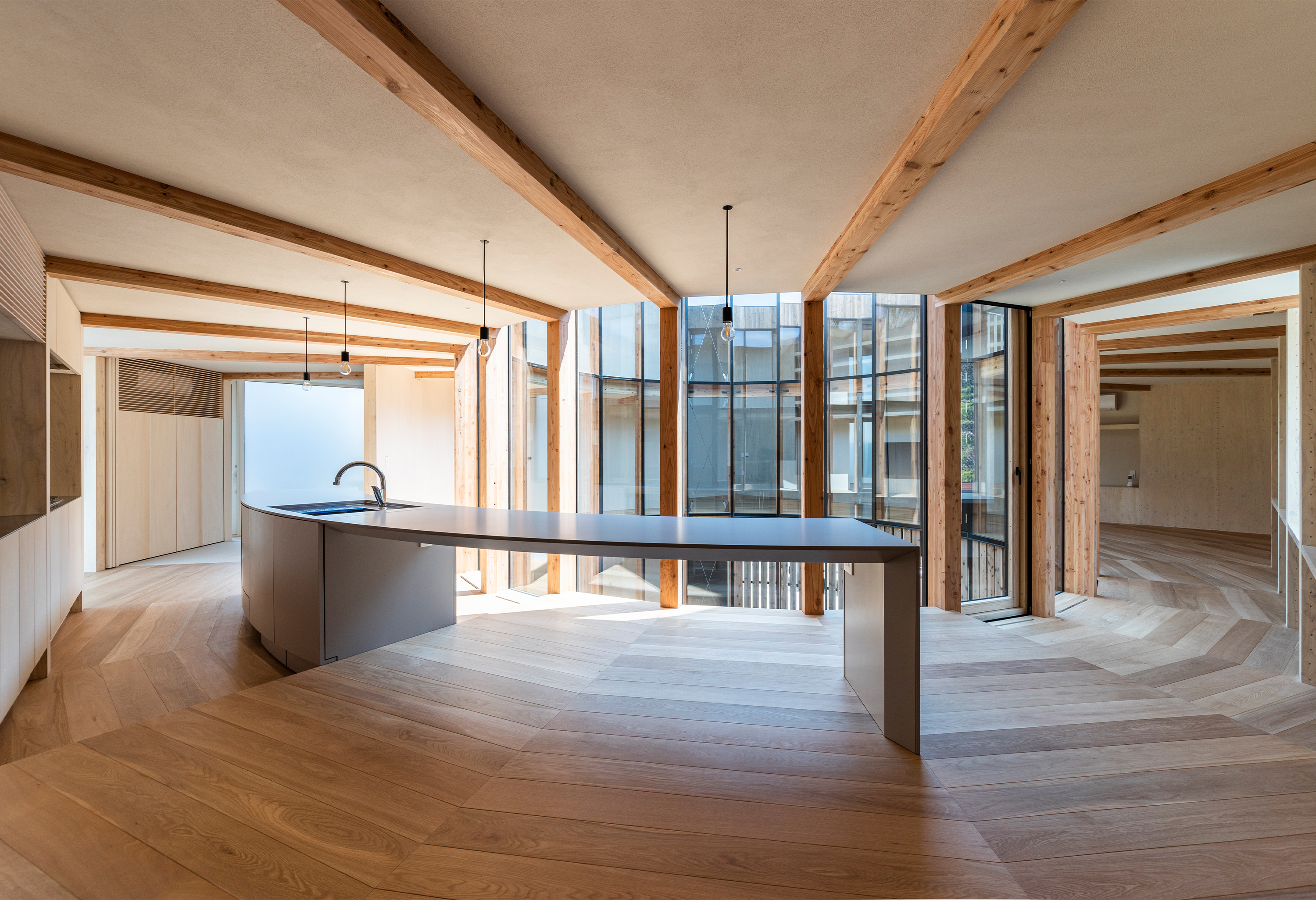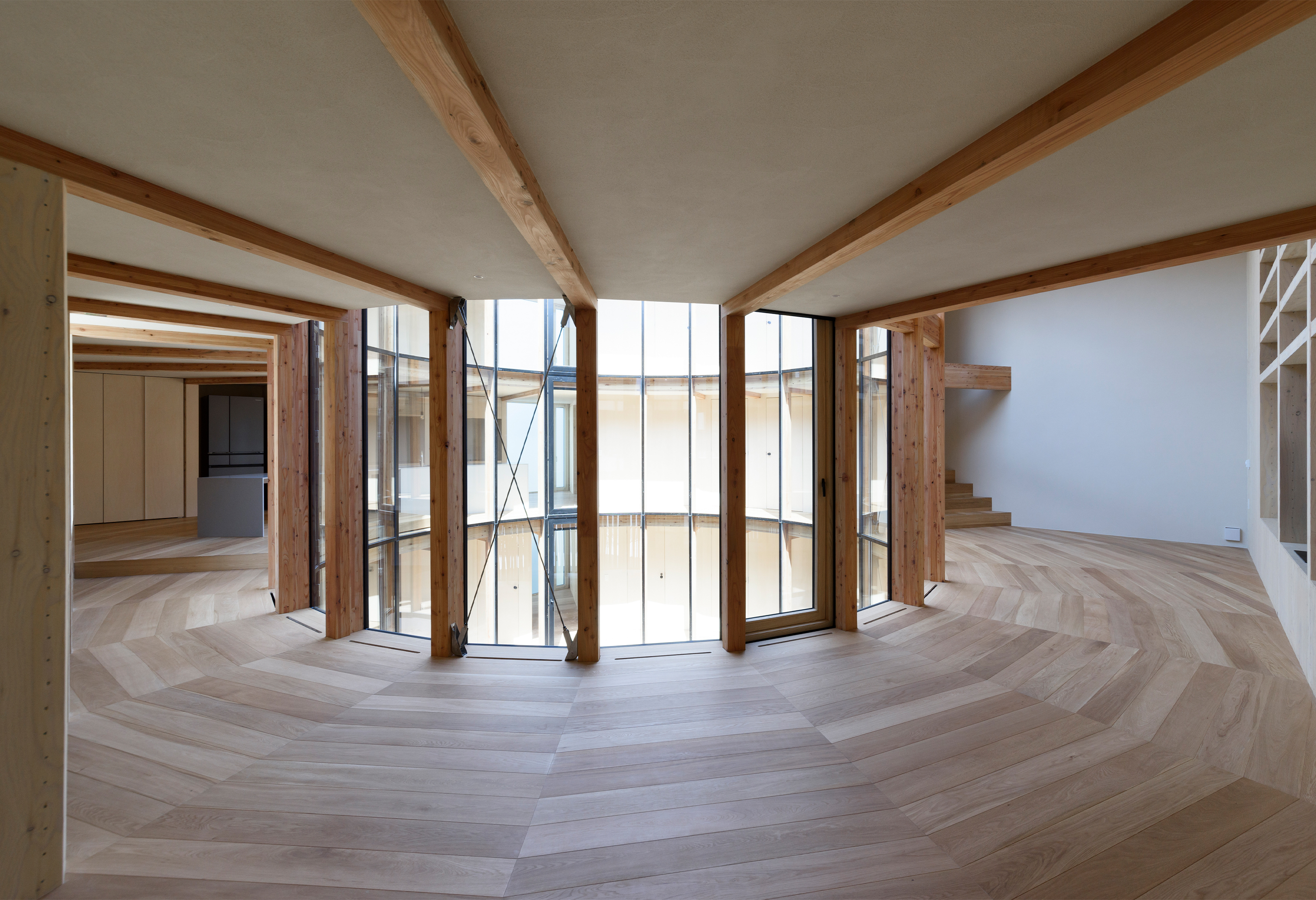 360° HOUSE is a single family home located in the outskirts of Sapporo, Japan. The residence is designed around a circular courtyard with timber construction radiating outward into the interior. The interior spaces are oriented towards the courtyard and follow the radial lines set out by the visible timber beams.