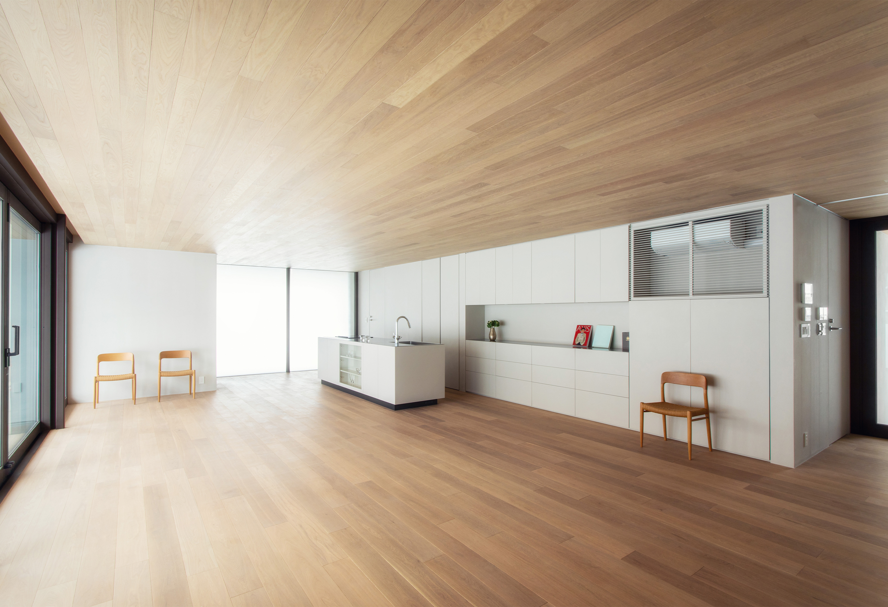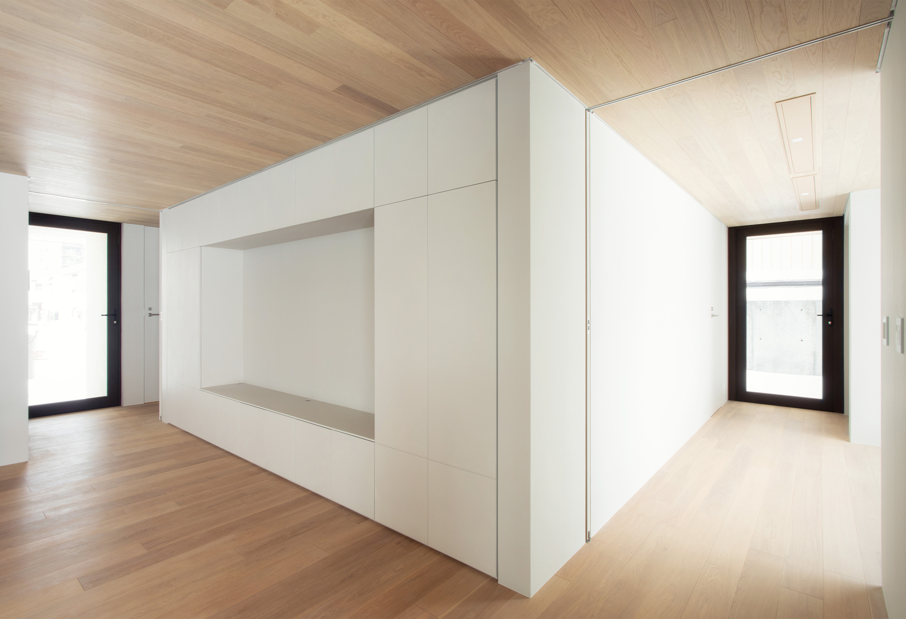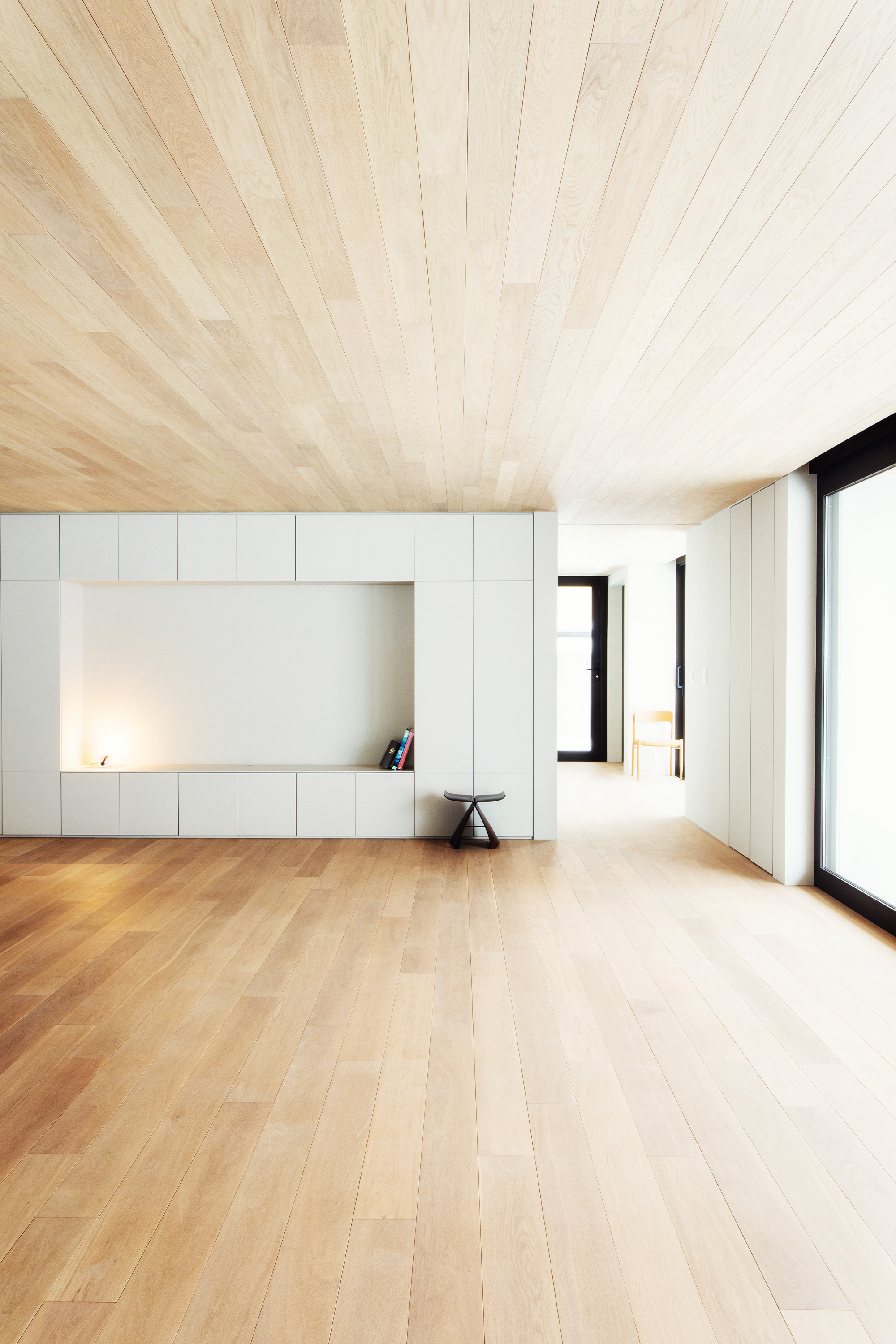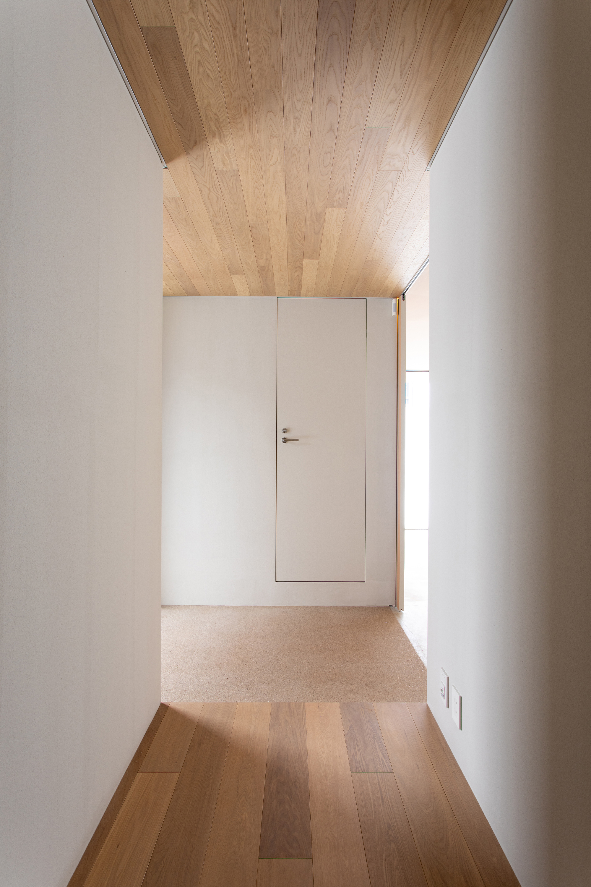 Inside box shaped volumes hold private rooms and service functions whilst also forming the structure that supports the roof.The living room, corridors and sunrooms together form an open, interconnected space between these closed of volumes.