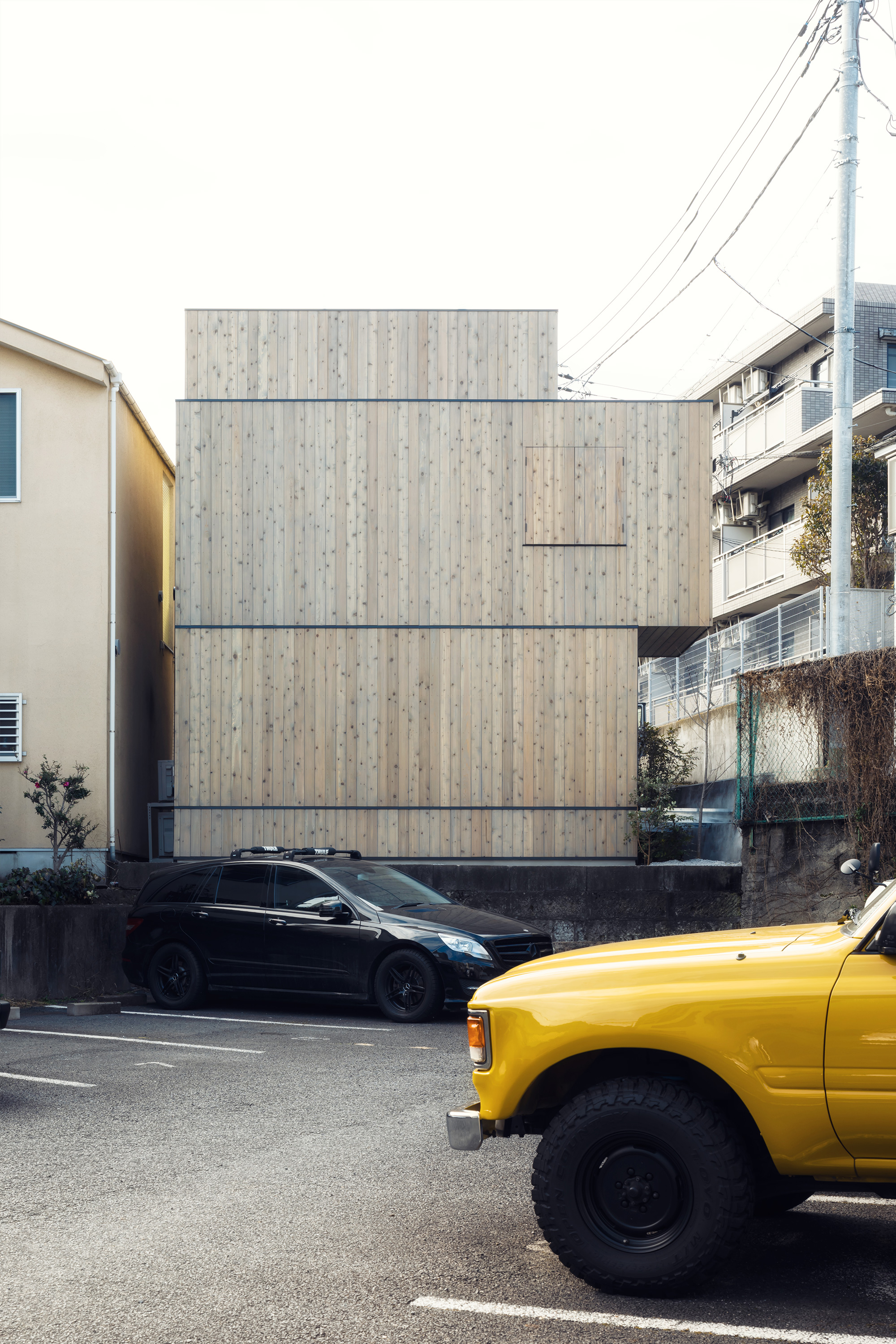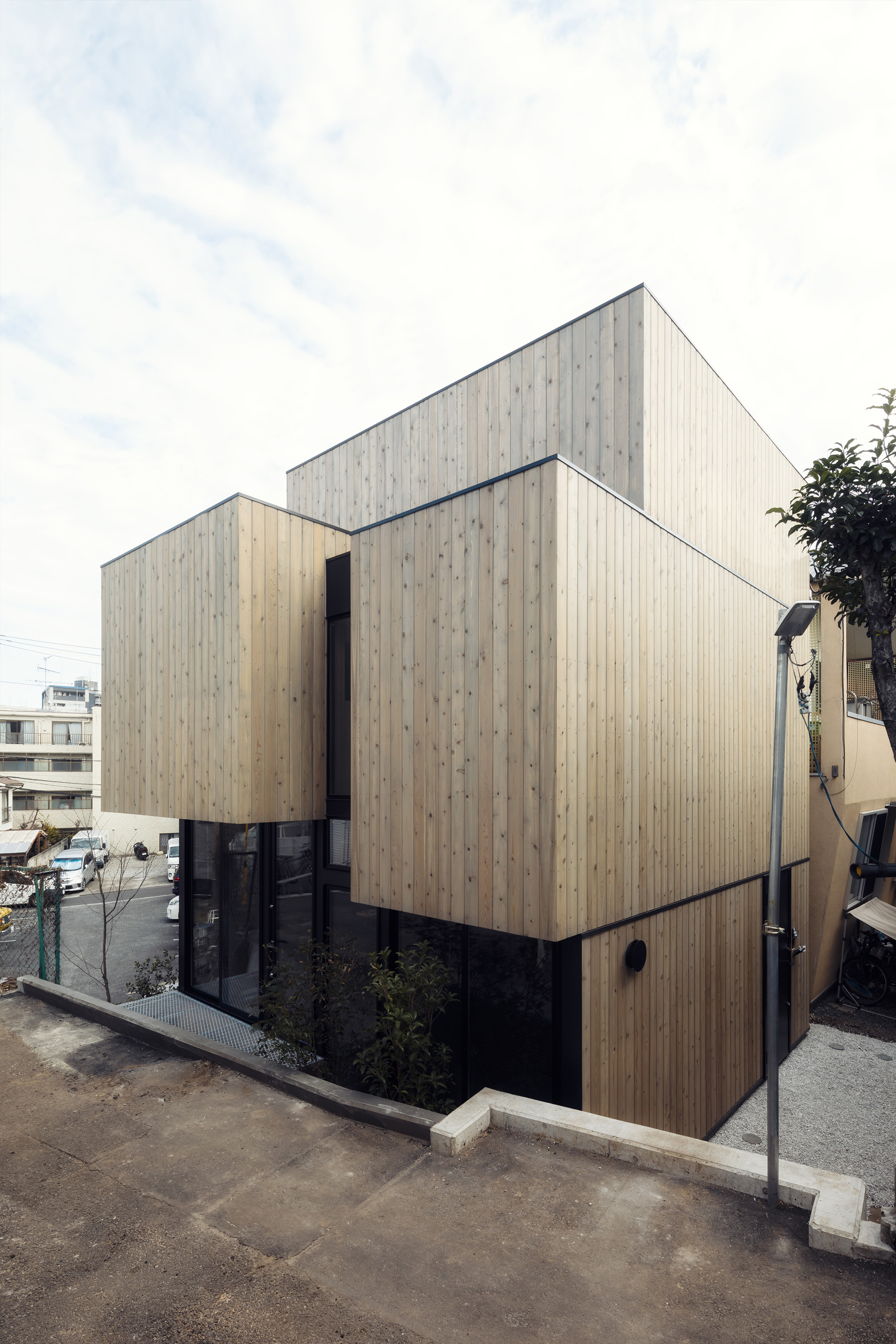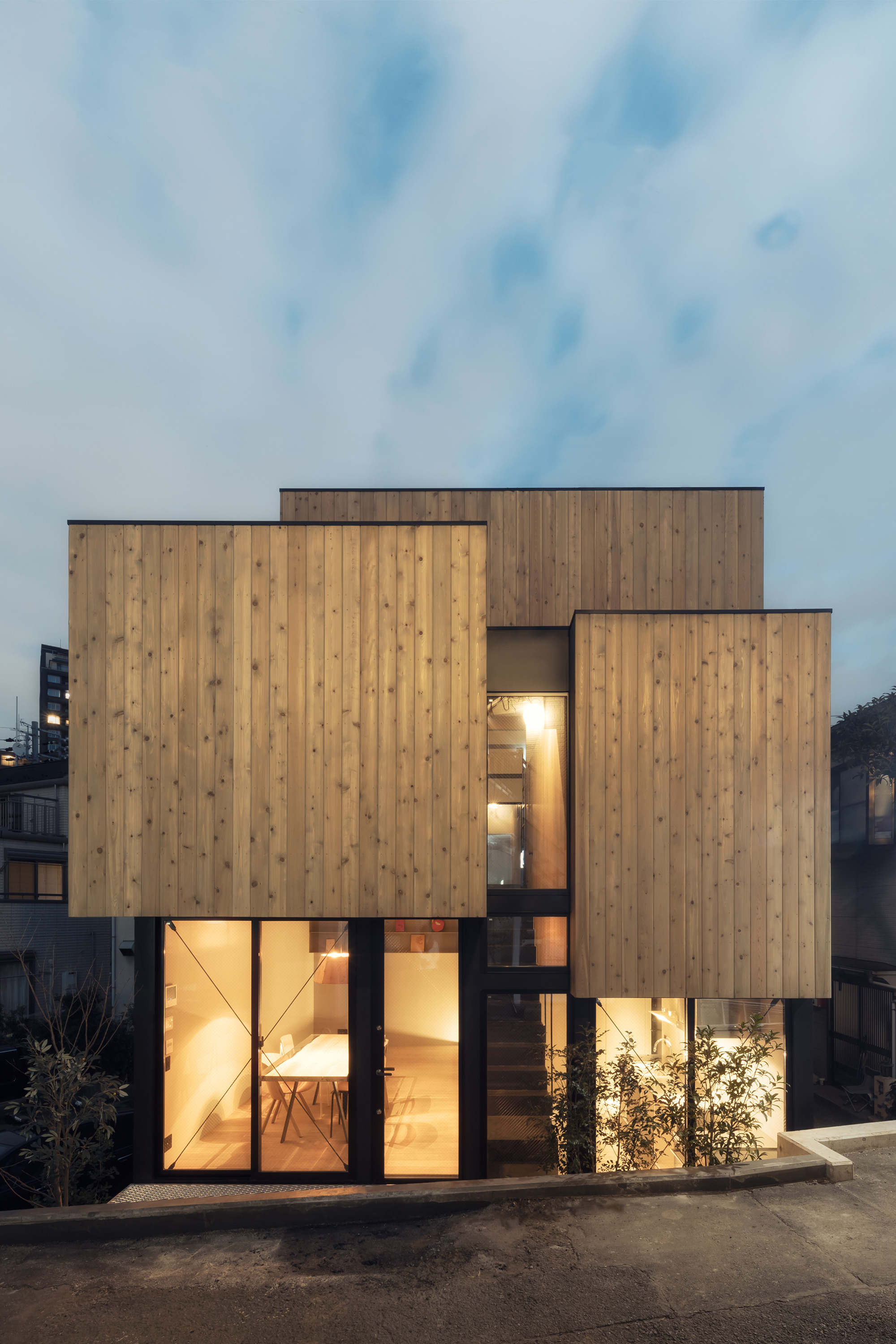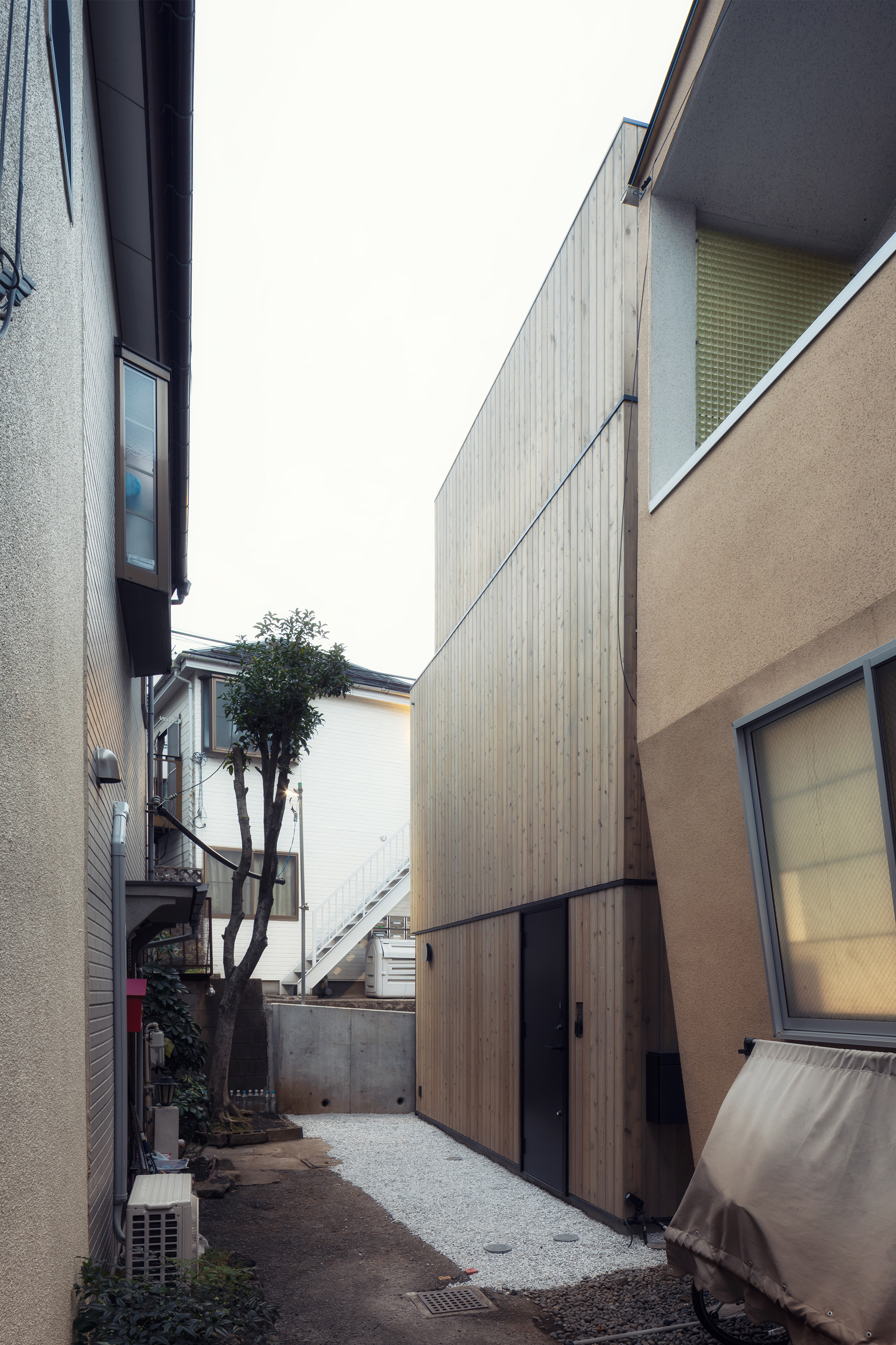 IN-BETWEEN DWELLING is a small single-family house located on a hillside in the Tomigaya area of central Tokyo. The site of the residence is enclosed by neighbouring houses, a rented car park and a private road, leaving a narrow alleyway as the only official access route. Designed for a family of four, the residence is centered around a 6.5m high stairwell that connects all the rooms and brings natural light into the home.