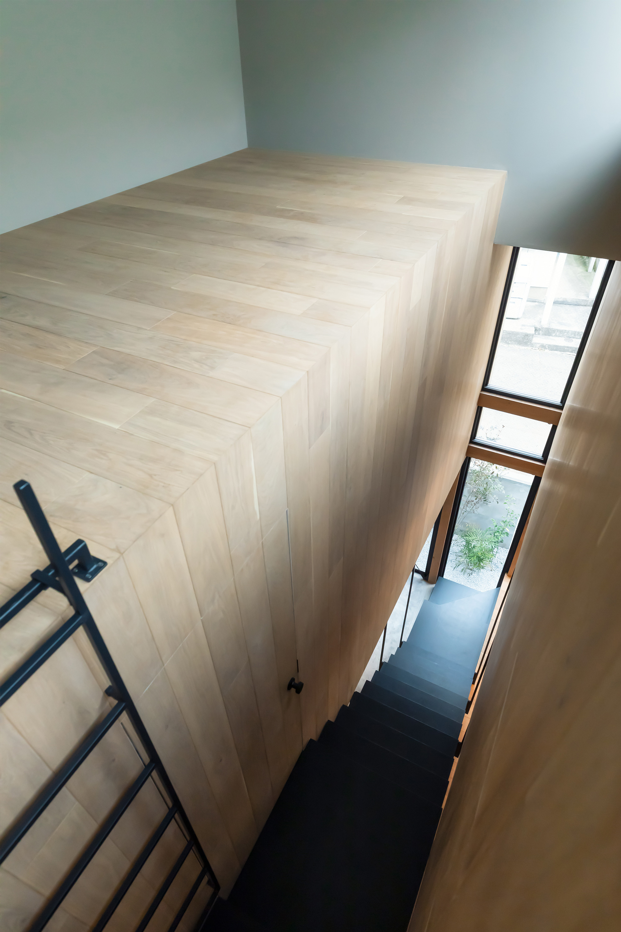 The staircase forms a continuous open space from the kitchen on the first floor to the loft. The space is lined with 3 wooden boxes that host more private functions. This spatial layout extends to the exterior, where the central space opens up through the large glass areas of the main facade.