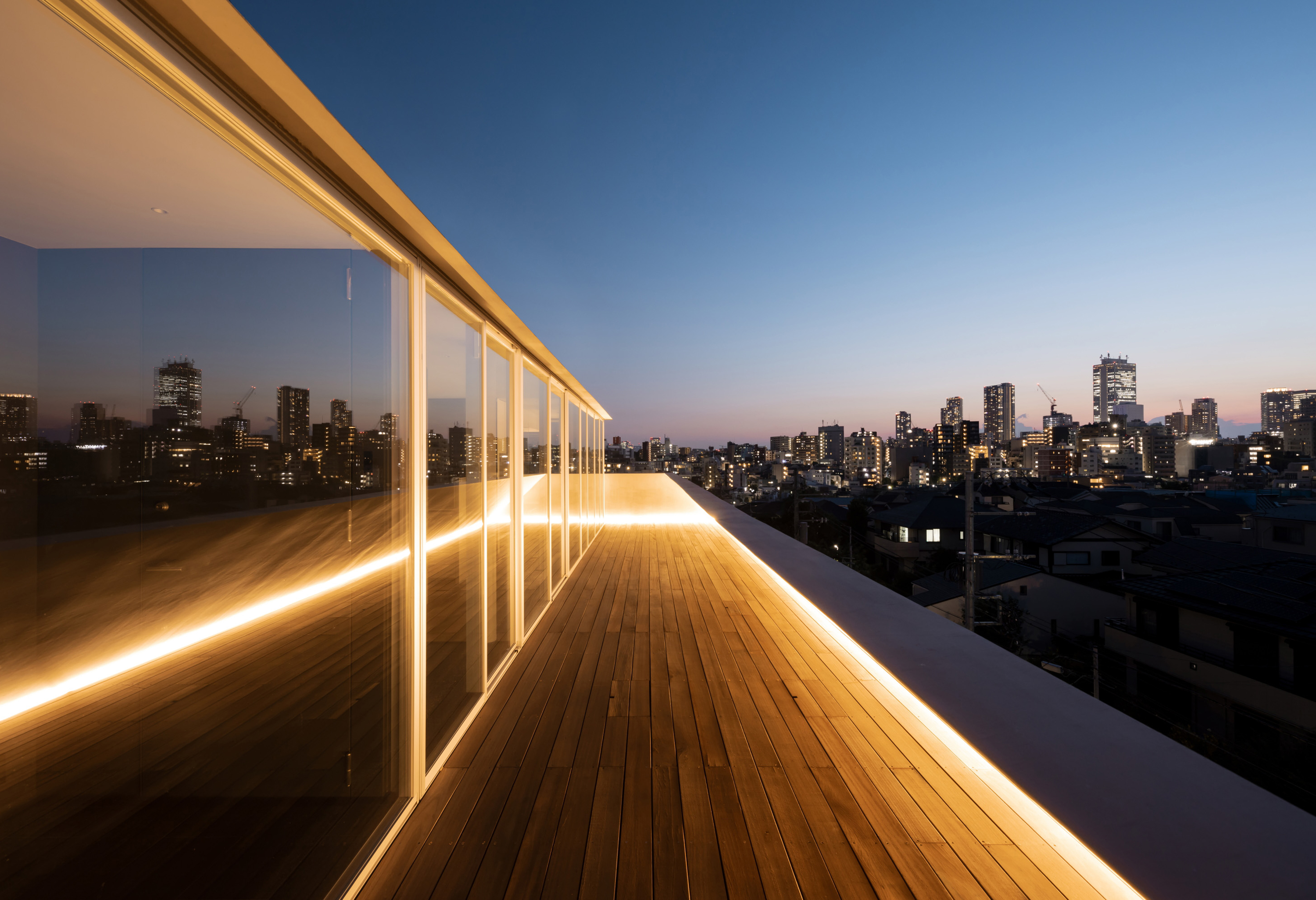 KAJITA APARTMENTS is a 5-story apartment complex located in a quiet residential area in Bunkyo Ward, central Tokyo. The building tries to maximize the rentable volume whilst architecturally adjusting its scale and appearance to the architectural context. By leaving space for an escape route and fire cistern in-between the building and its direct neighbors, all four sides of the building approach their surroundings similarly. Thus, by creating a building with a diamond shaped section in all directions, light is able to reach the surrounding streets and plots whilst simultaneously facilitating space on the ground floor level for lush gardens. This ensures that passerby’s will not see the upper levels directly and creates a privacy barrier between public space, nearby residences and the ground floor apartments. Likewise this shape ensures the perceptible scale difference between the apartment building and its smaller neighbors is reduced. This way the buildings fit’s in snugly with its direct urban surroundings and provides the neighborhood with public green space.