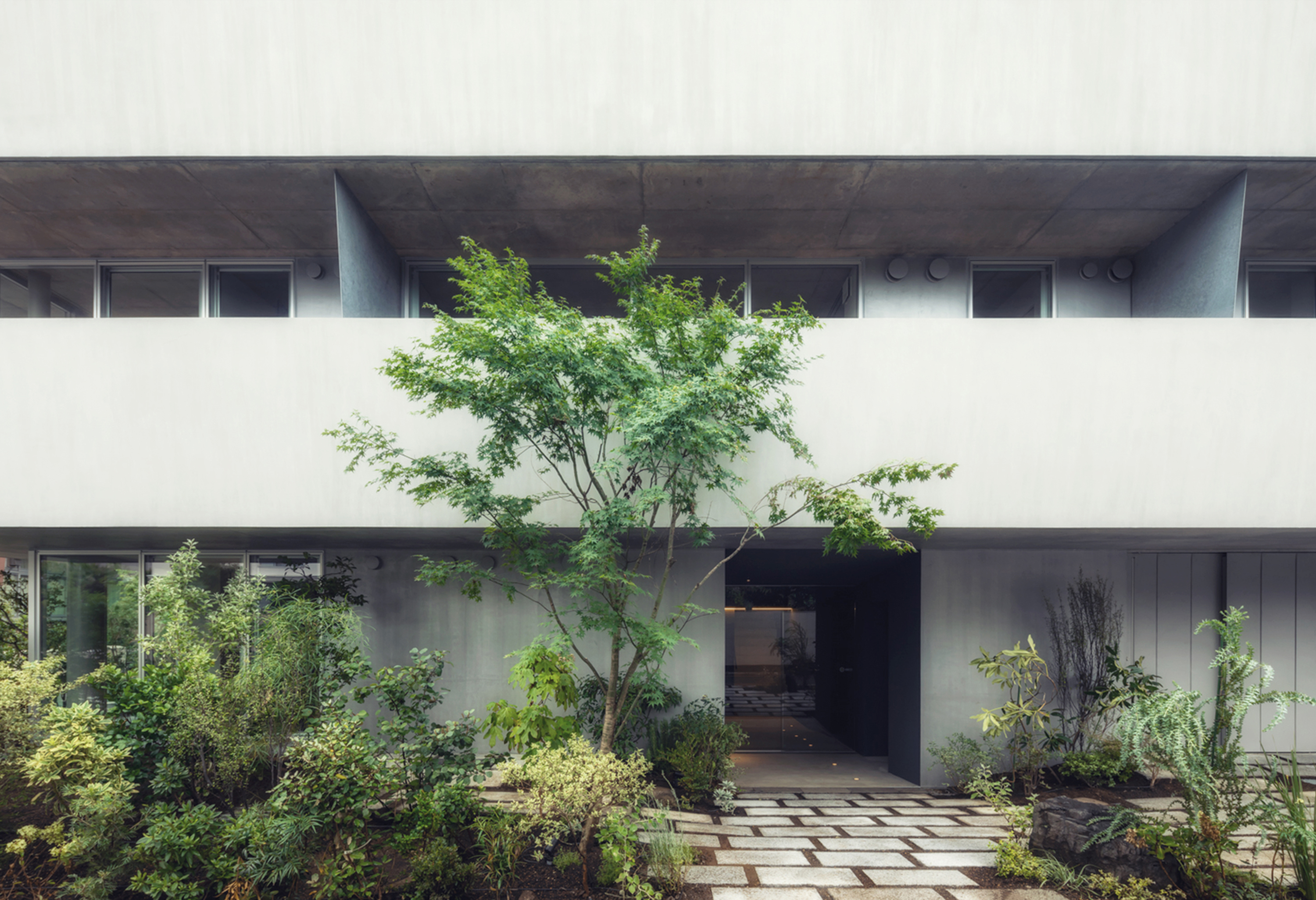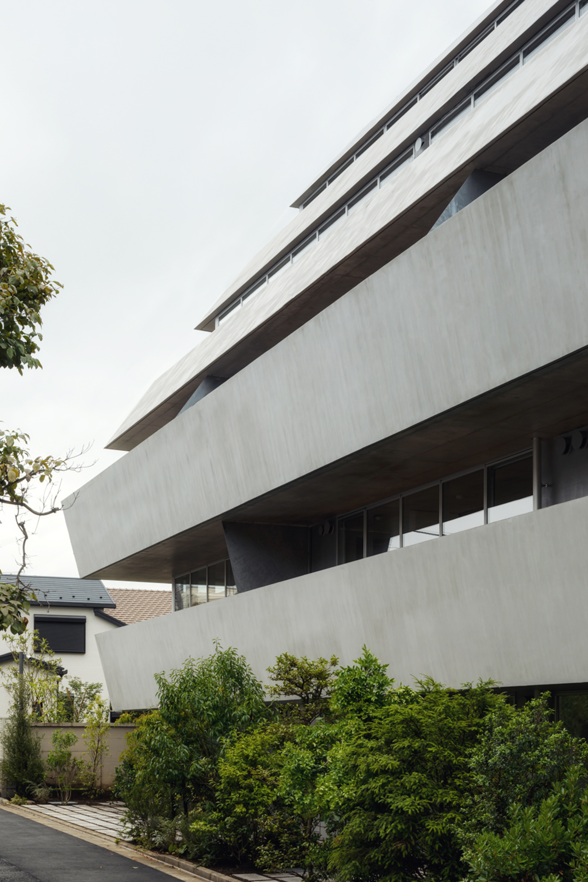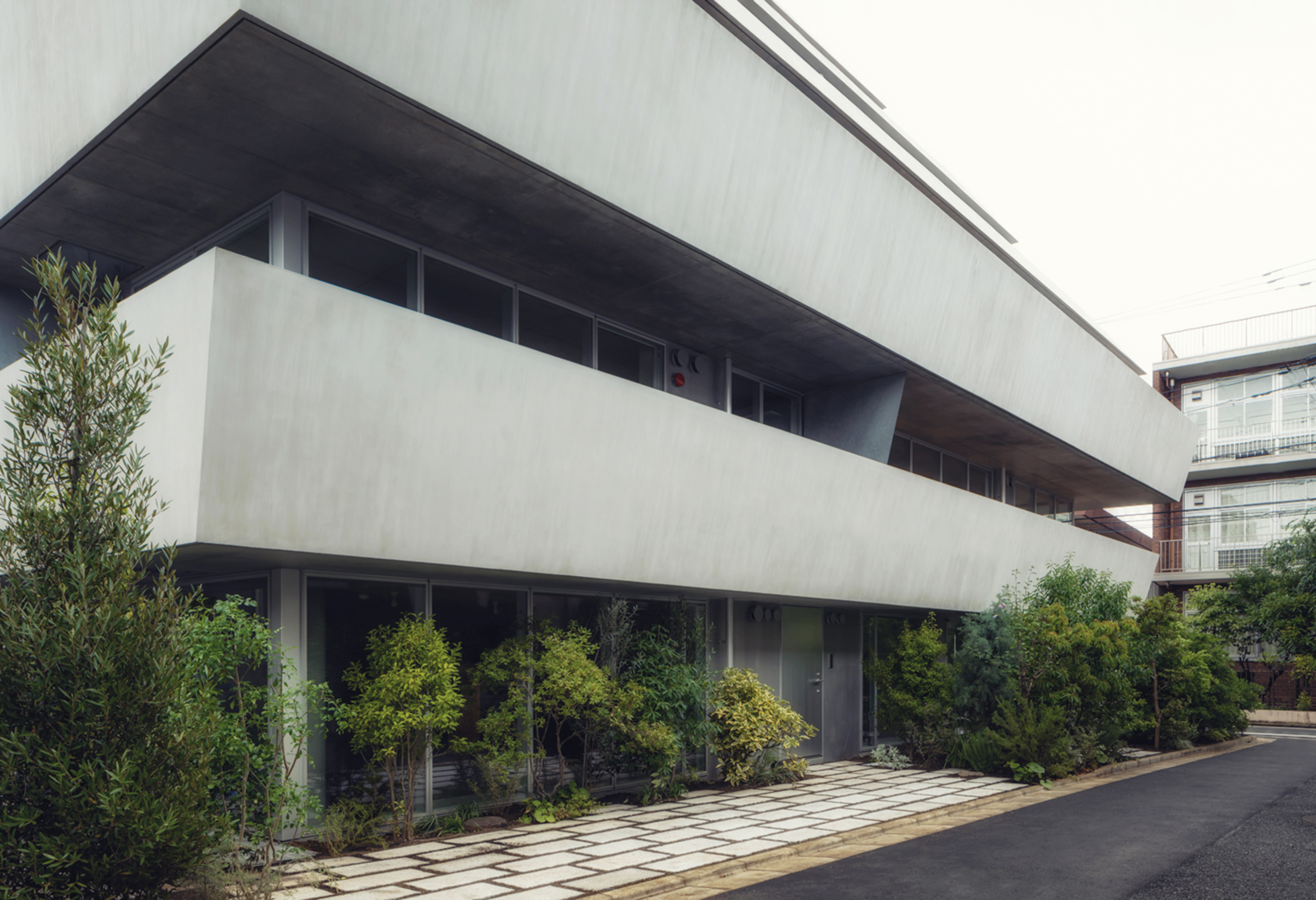 KAJITA APARTMENTS is a 5-story apartment complex located in a quiet residential area in Bunkyo Ward, central Tokyo. The building tries to maximize the rentable volume whilst architecturally adjusting its scale and appearance to the architectural context. By leaving space for an escape route and fire cistern in-between the building and its direct neighbors, all four sides of the building approach their surroundings similarly. Thus, by creating a building with a diamond shaped section in all directions, light is able to reach the surrounding streets and plots whilst simultaneously facilitating space on the ground floor level for lush gardens. This ensures that passerby’s will not see the upper levels directly and creates a privacy barrier between public space, nearby residences and the ground floor apartments. Likewise this shape ensures the perceptible scale difference between the apartment building and its smaller neighbors is reduced. This way the buildings fit’s in snugly with its direct urban surroundings and provides the neighborhood with public green space.