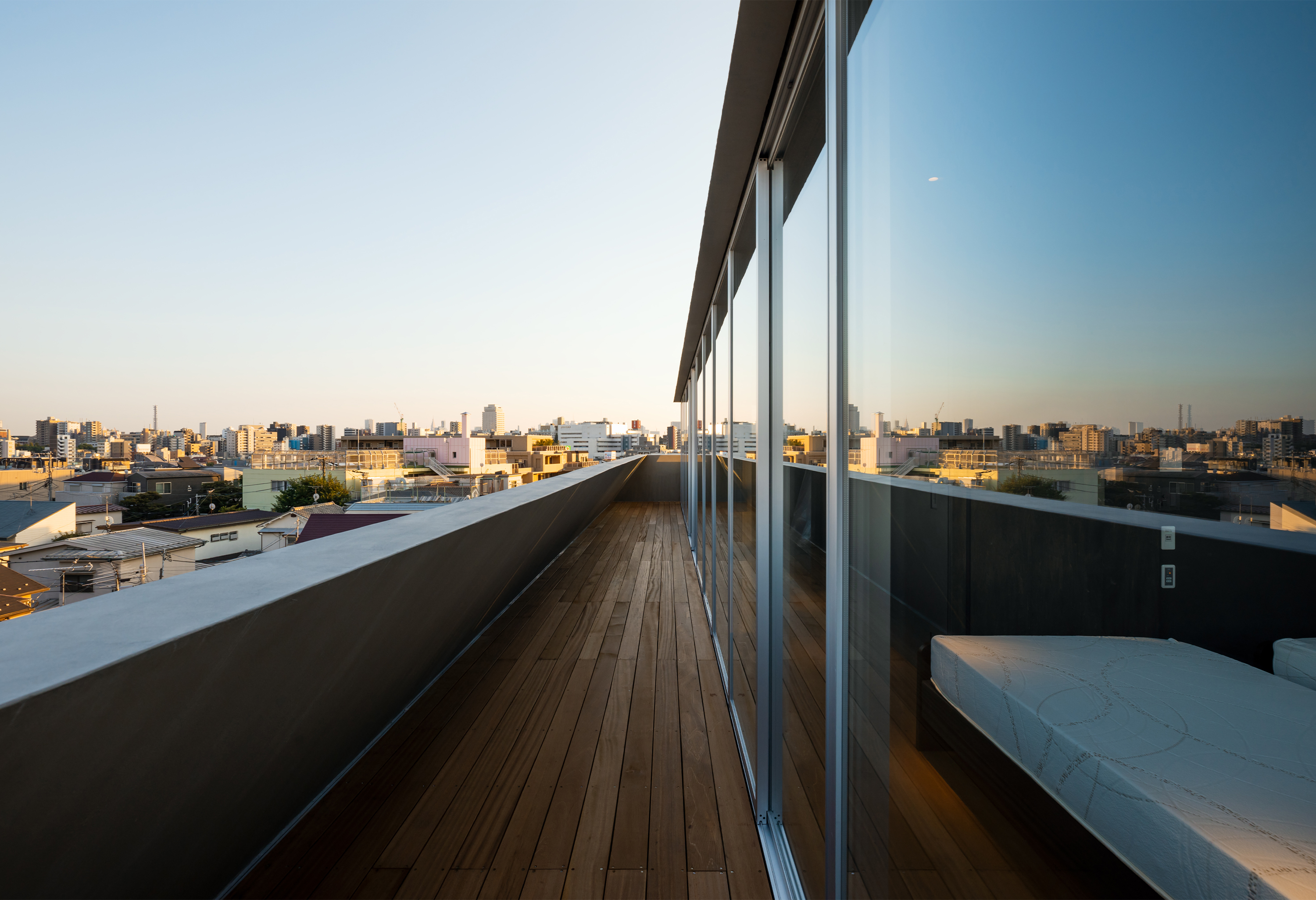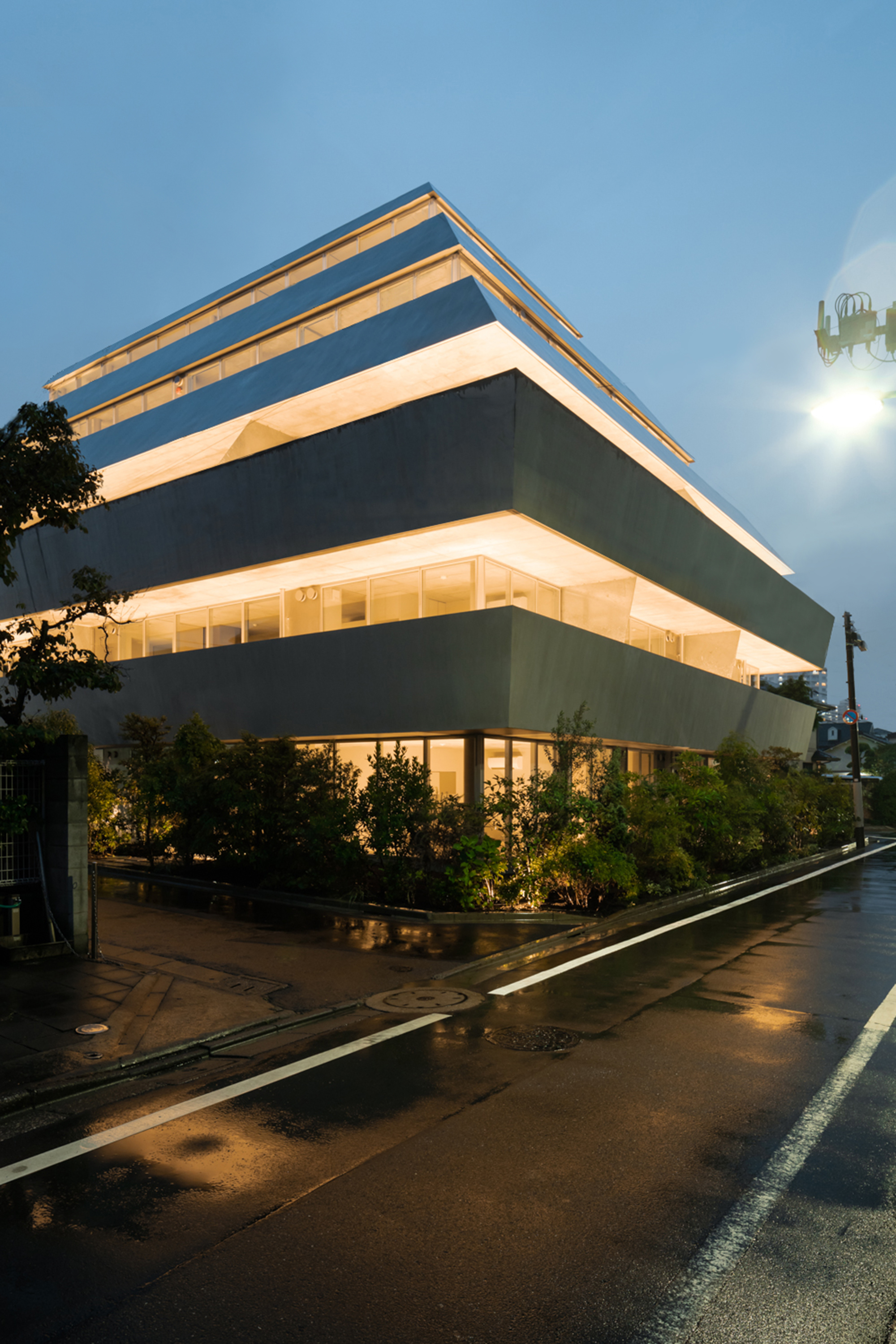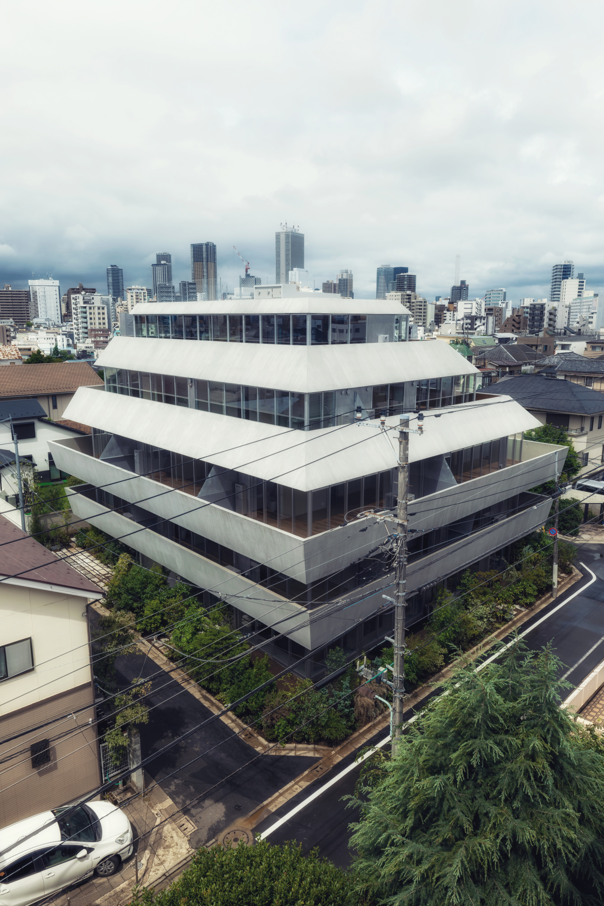 KAJITA APARTMENTS is a 5-story apartment complex located in a quiet residential area in Bunkyo Ward, central Tokyo. The building tries to maximize the rentable volume whilst architecturally adjusting its scale and appearance to the architectural context. By leaving space for an escape route and fire cistern in-between the building and its direct neighbors, all four sides of the building approach their surroundings similarly. Thus, by creating a building with a diamond shaped section in all directions, light is able to reach the surrounding streets and plots whilst simultaneously facilitating space on the ground floor level for lush gardens. This ensures that passerby’s will not see the upper levels directly and creates a privacy barrier between public space, nearby residences and the ground floor apartments. Likewise this shape ensures the perceptible scale difference between the apartment building and its smaller neighbors is reduced. This way the buildings fit’s in snugly with its direct urban surroundings and provides the neighborhood with public green space.