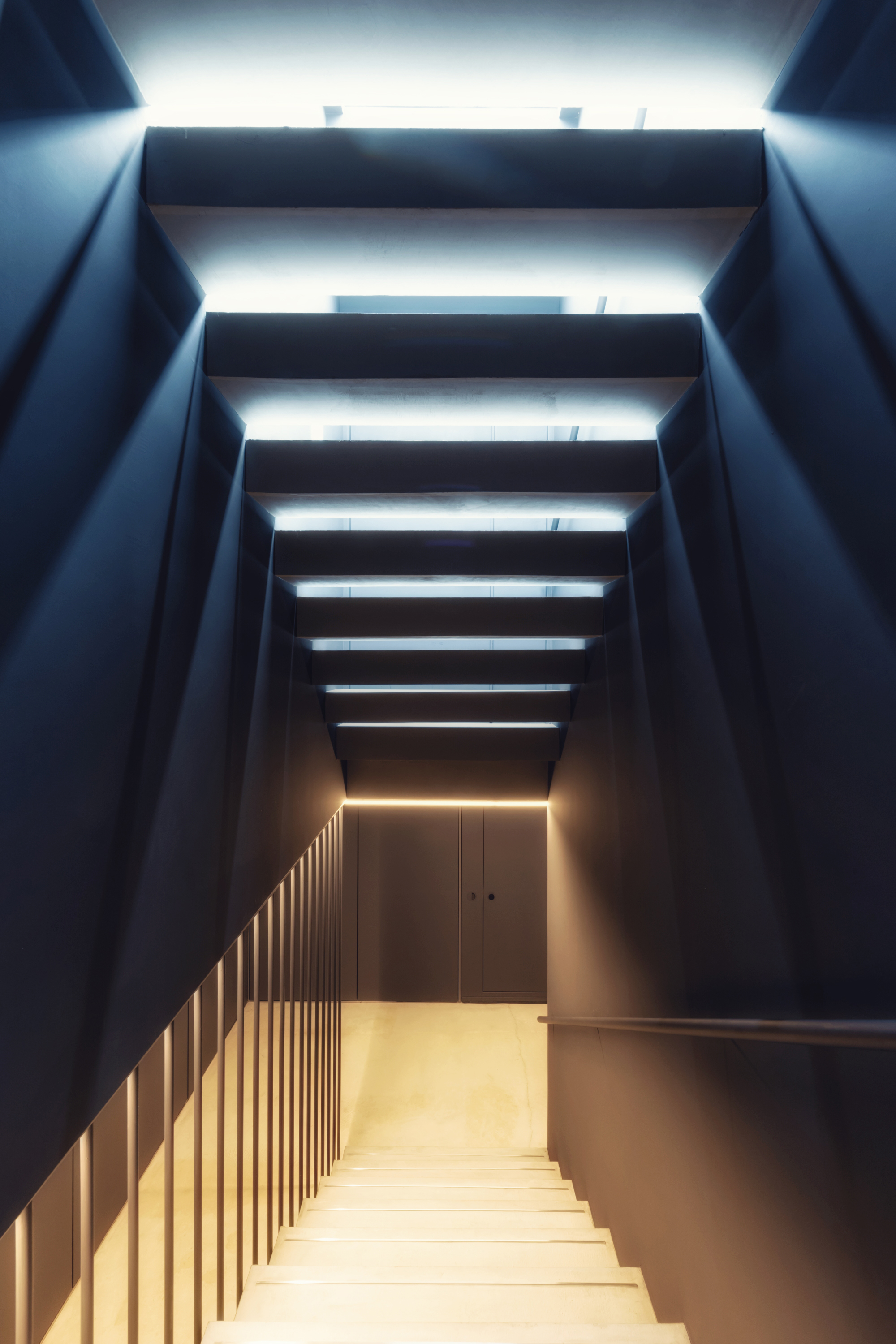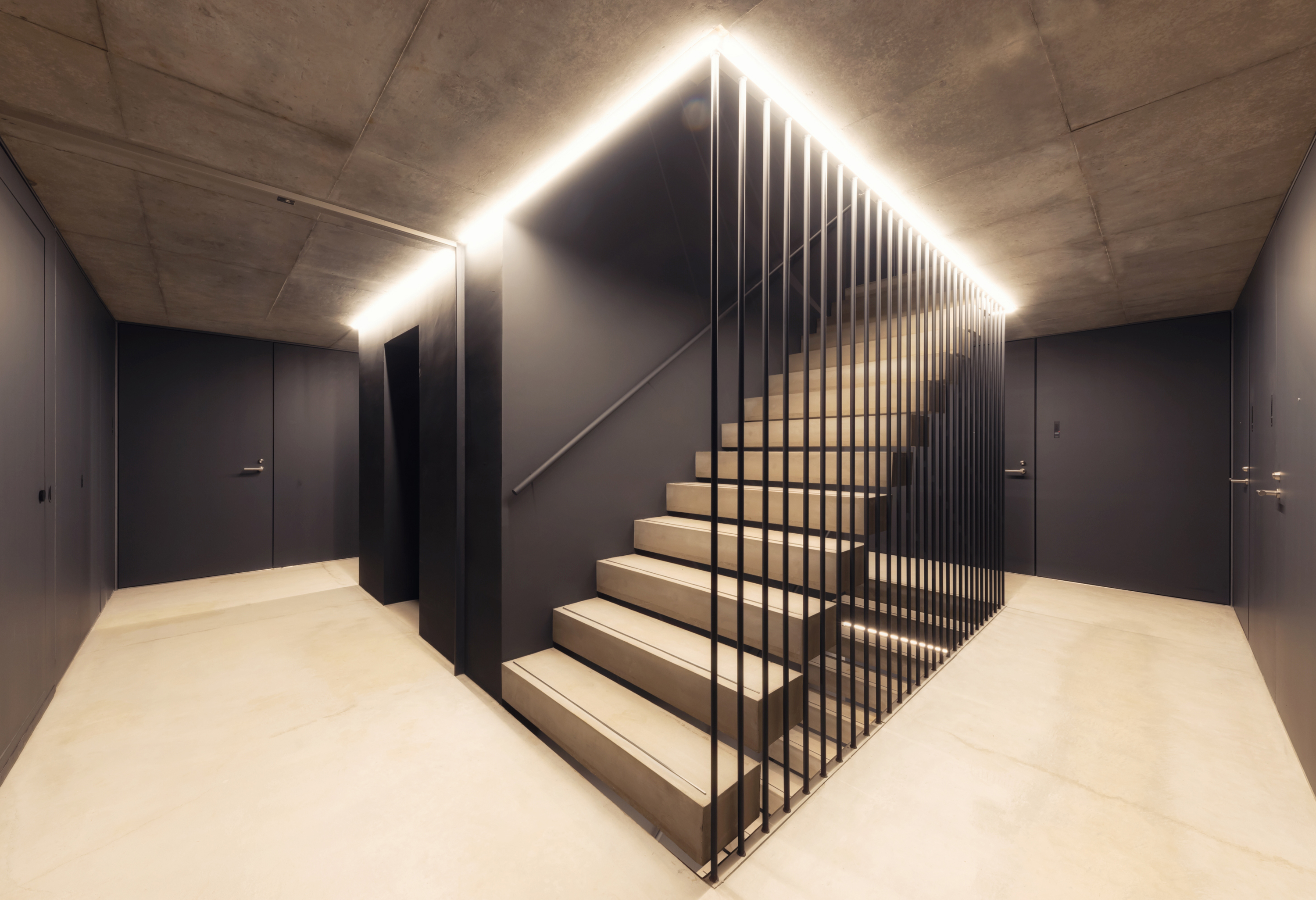 The apartment complex’ visually most striking element are the 4 horizontal bands wrapped around the apartments. These are constructed out of cast-in-situ concrete, enabling a floating uniform esthetic. The bands function as guards for the balconies which run all the way around the building. Simultaneously they form a privacy barrier towards the streets and create a panoramic view of the cityscape from the interior. Structurally the building rests mainly on the central access core of the building leaving the outer facades largely glass.