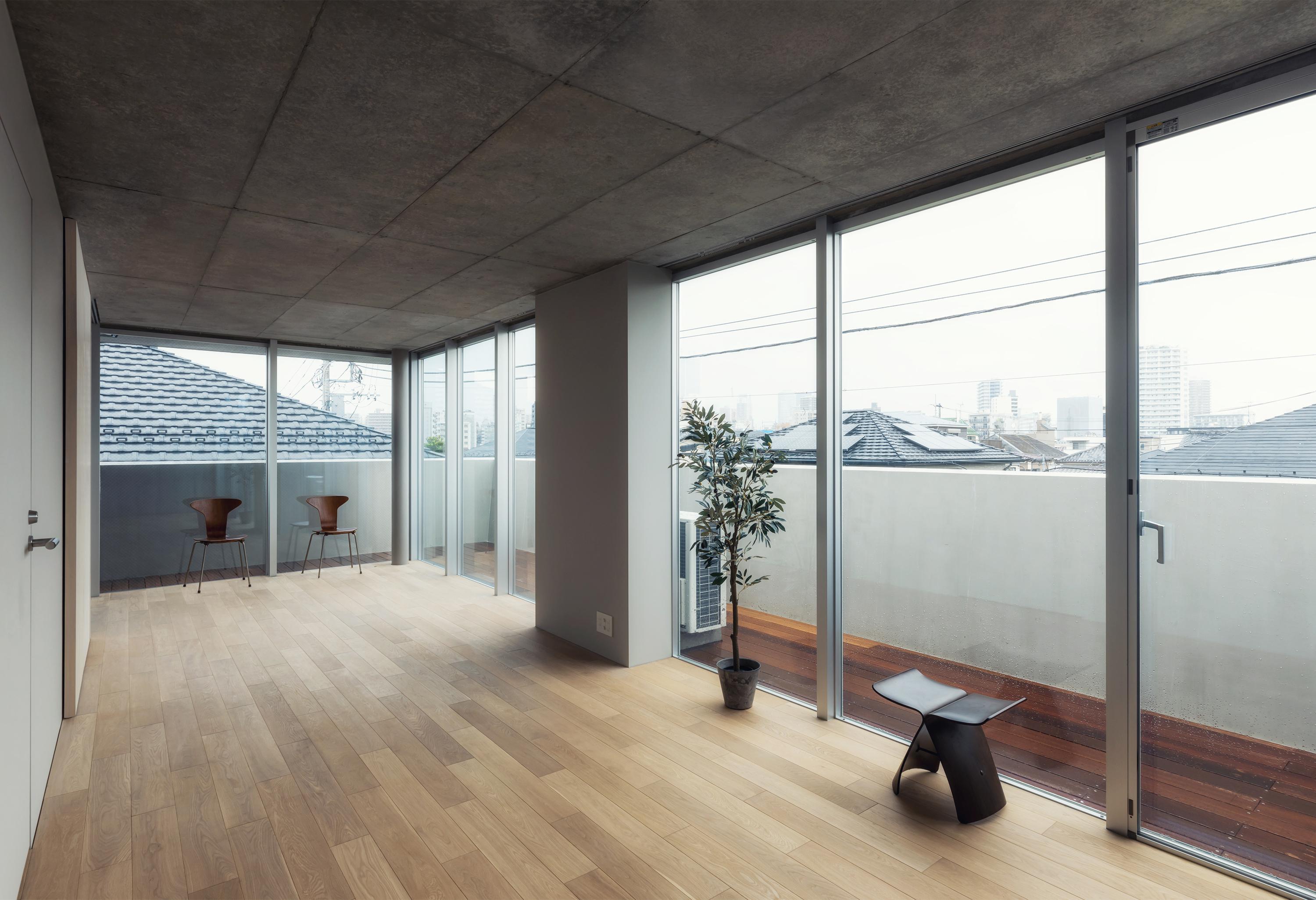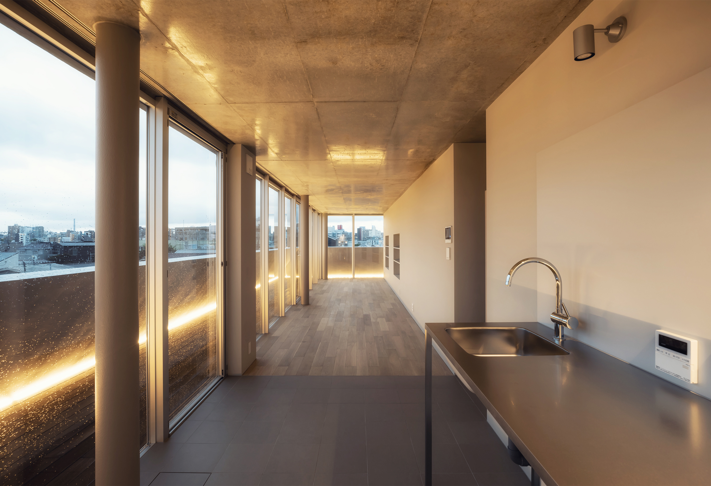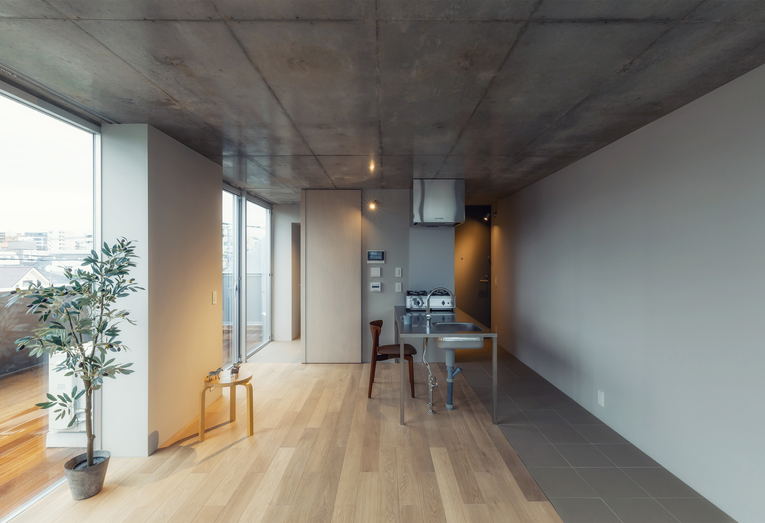 KAJITA APARTMENTS is a 5-story apartment complex located in a quiet residential area in Bunkyo Ward, central Tokyo. The building tries to maximize the rentable volume whilst architecturally adjusting its scale and appearance to the architectural context. By leaving space for an escape route and fire cistern in-between the building and its direct neighbors, all four sides of the building approach their surroundings similarly. Thus, by creating a building with a diamond shaped section in all directions, light is able to reach the surrounding streets and plots whilst simultaneously facilitating space on the ground floor level for lush gardens. This ensures that passerby’s will not see the upper levels directly and creates a privacy barrier between public space, nearby residences and the ground floor apartments. Likewise this shape ensures the perceptible scale difference between the apartment building and its smaller neighbors is reduced. This way the buildings fit’s in snugly with its direct urban surroundings and provides the neighborhood with public green space.