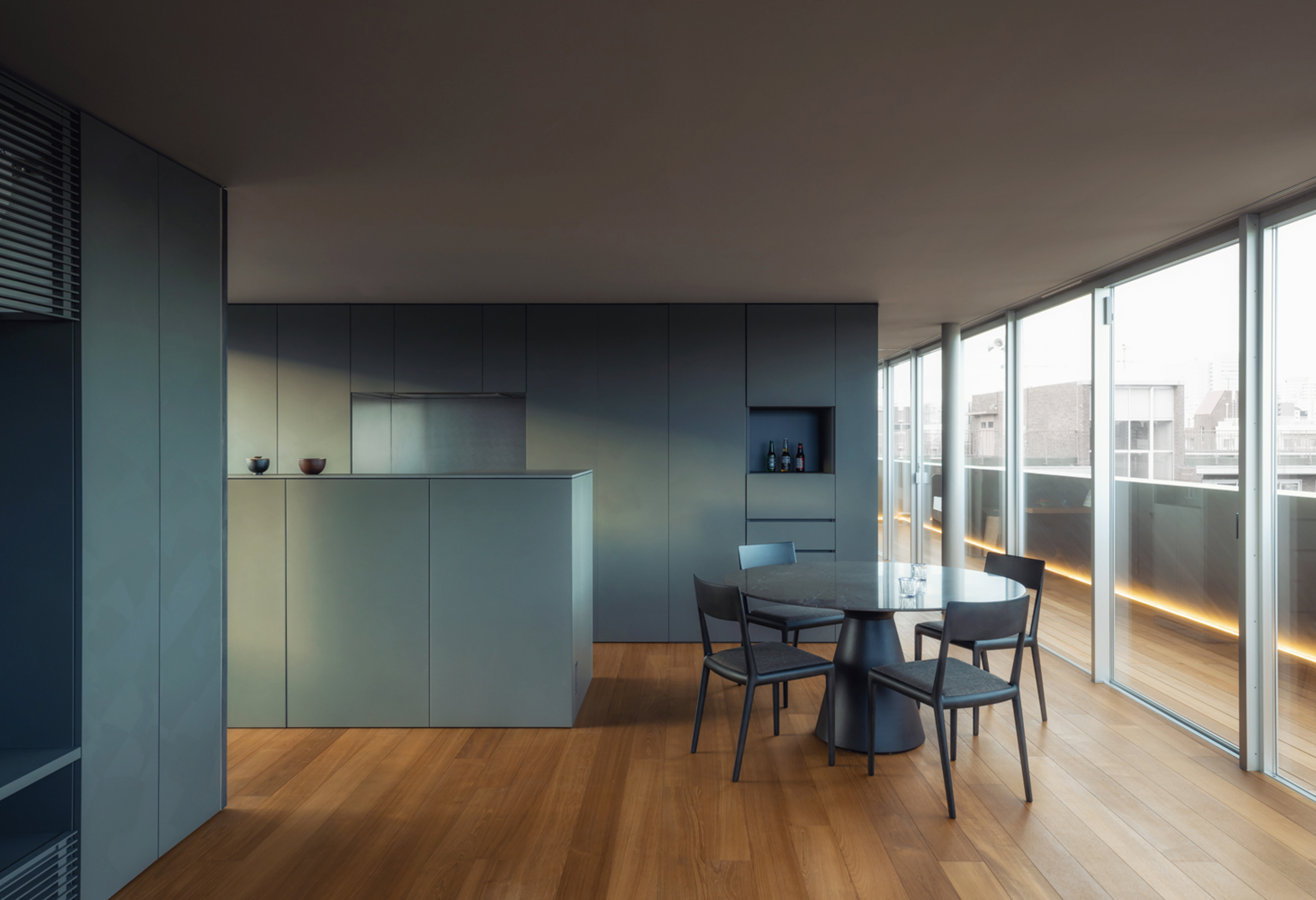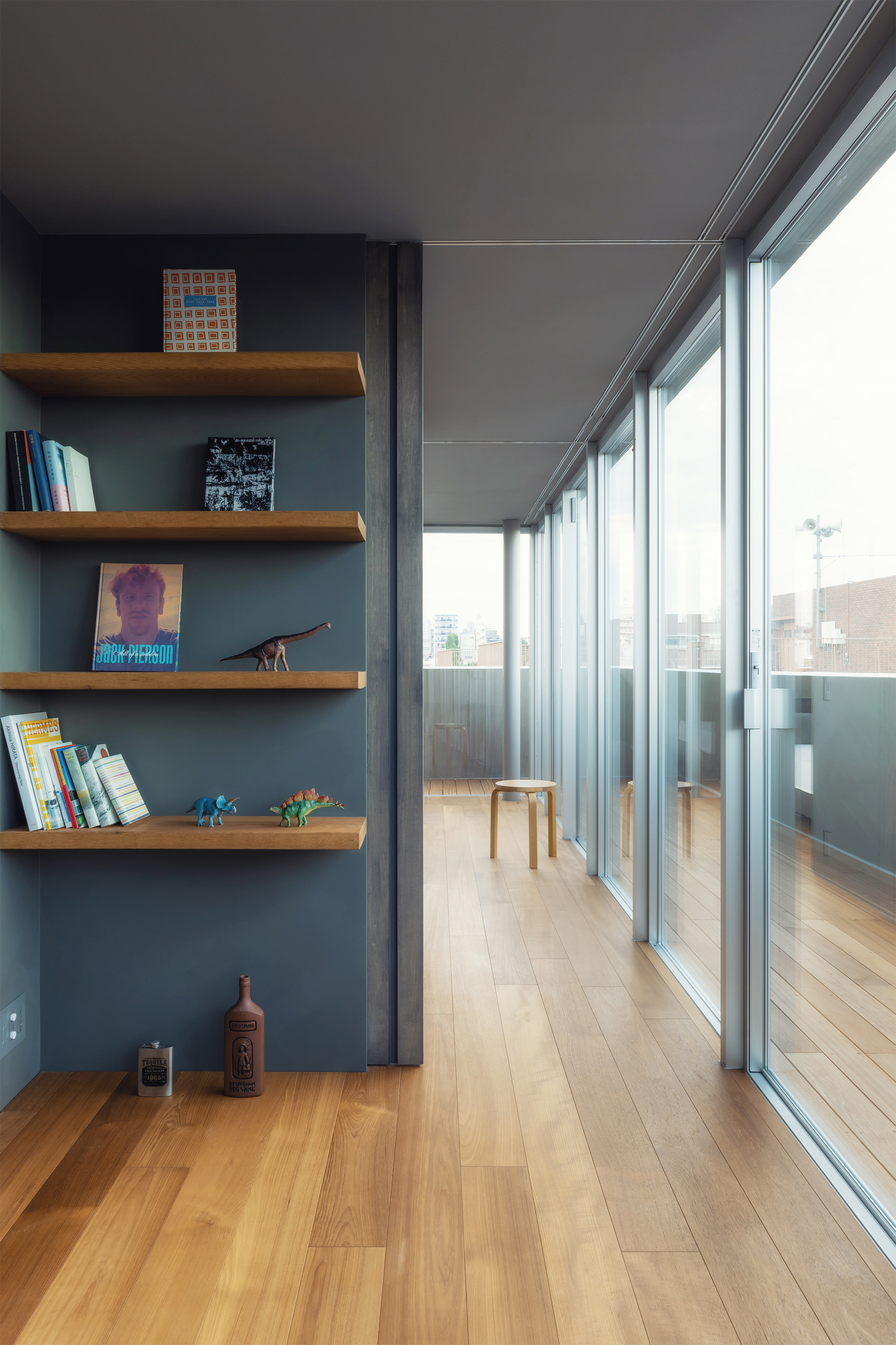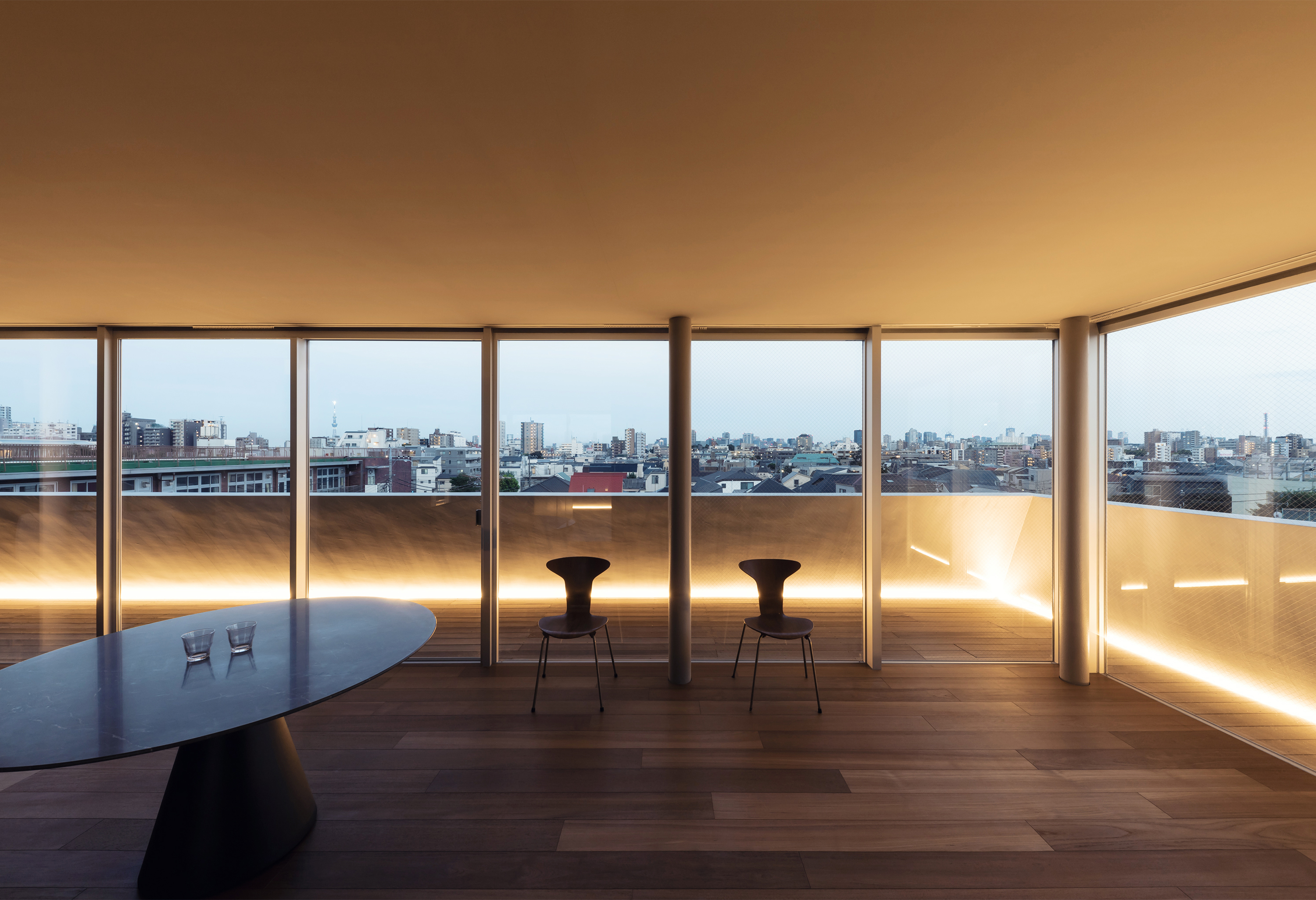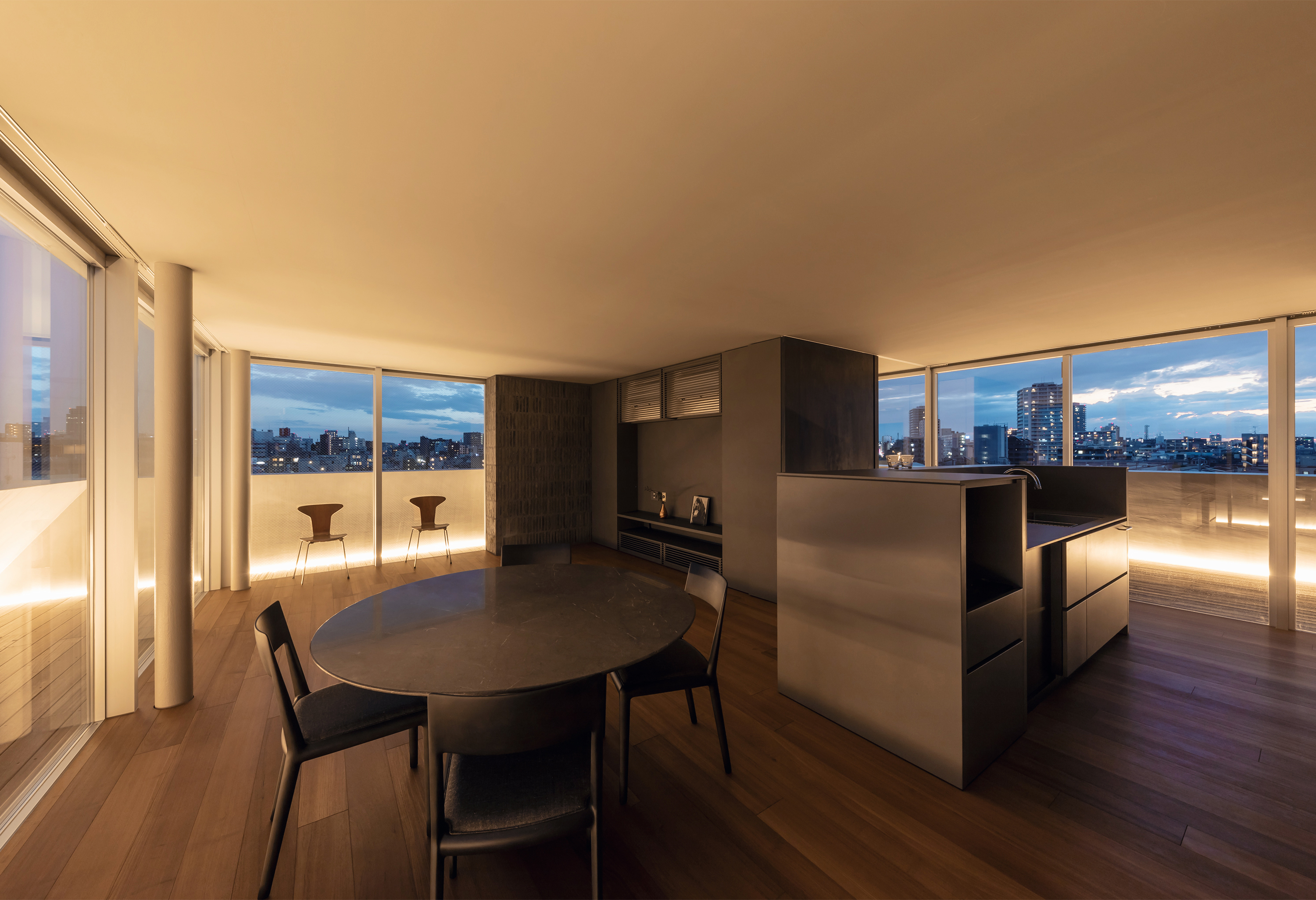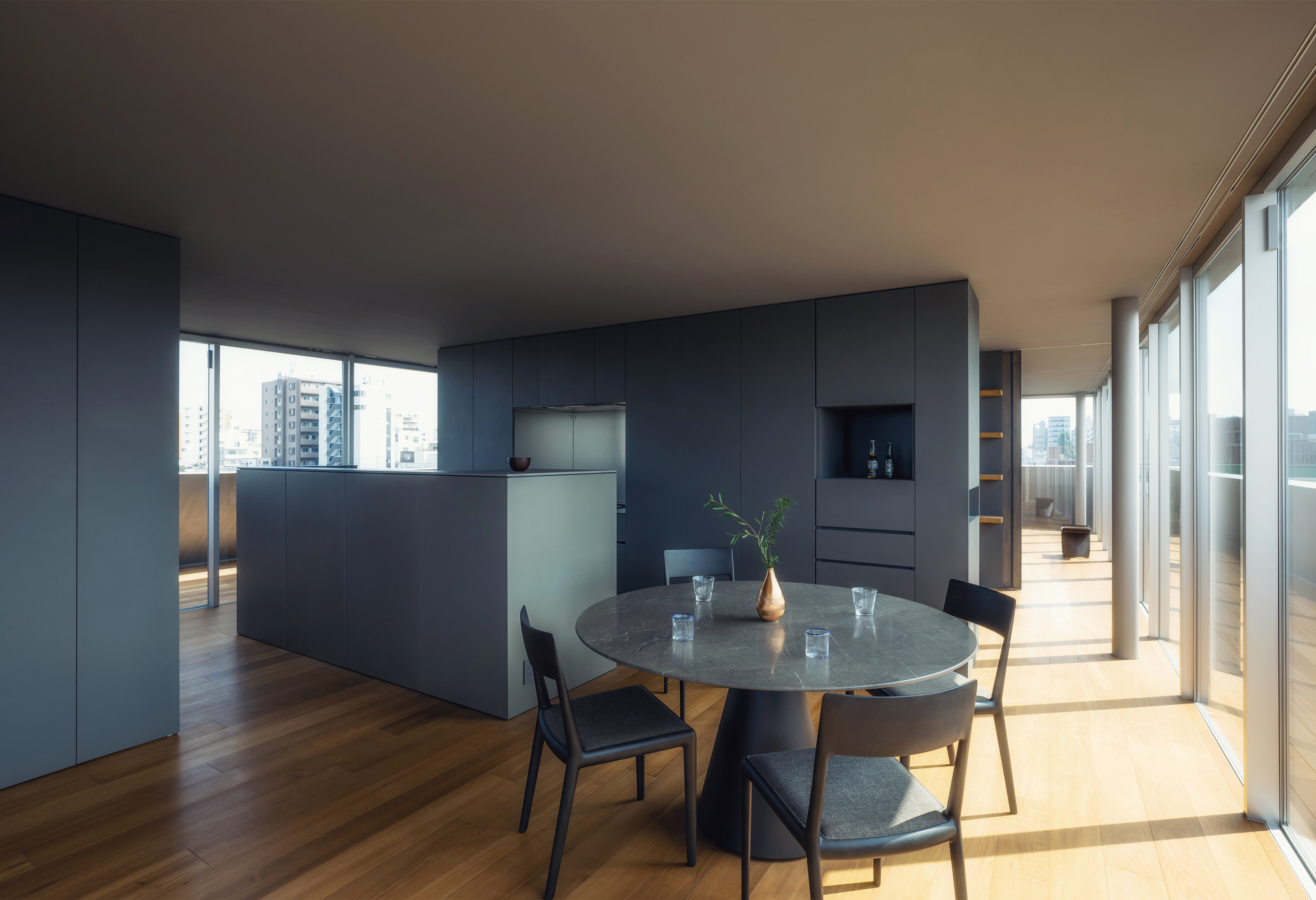 KAJITA APARTMENTS is a 5-story apartment complex located in a quiet residential area in Bunkyo Ward, central Tokyo. The building tries to maximize the rentable volume whilst architecturally adjusting its scale and appearance to the architectural context. By leaving space for an escape route and fire cistern in-between the building and its direct neighbors, all four sides of the building approach their surroundings similarly. Thus, by creating a building with a diamond shaped section in all directions, light is able to reach the surrounding streets and plots whilst simultaneously facilitating space on the ground floor level for lush gardens. This ensures that passerby’s will not see the upper levels directly and creates a privacy barrier between public space, nearby residences and the ground floor apartments. Likewise this shape ensures the perceptible scale difference between the apartment building and its smaller neighbors is reduced. This way the buildings fit’s in snugly with its direct urban surroundings and provides the neighborhood with public green space.