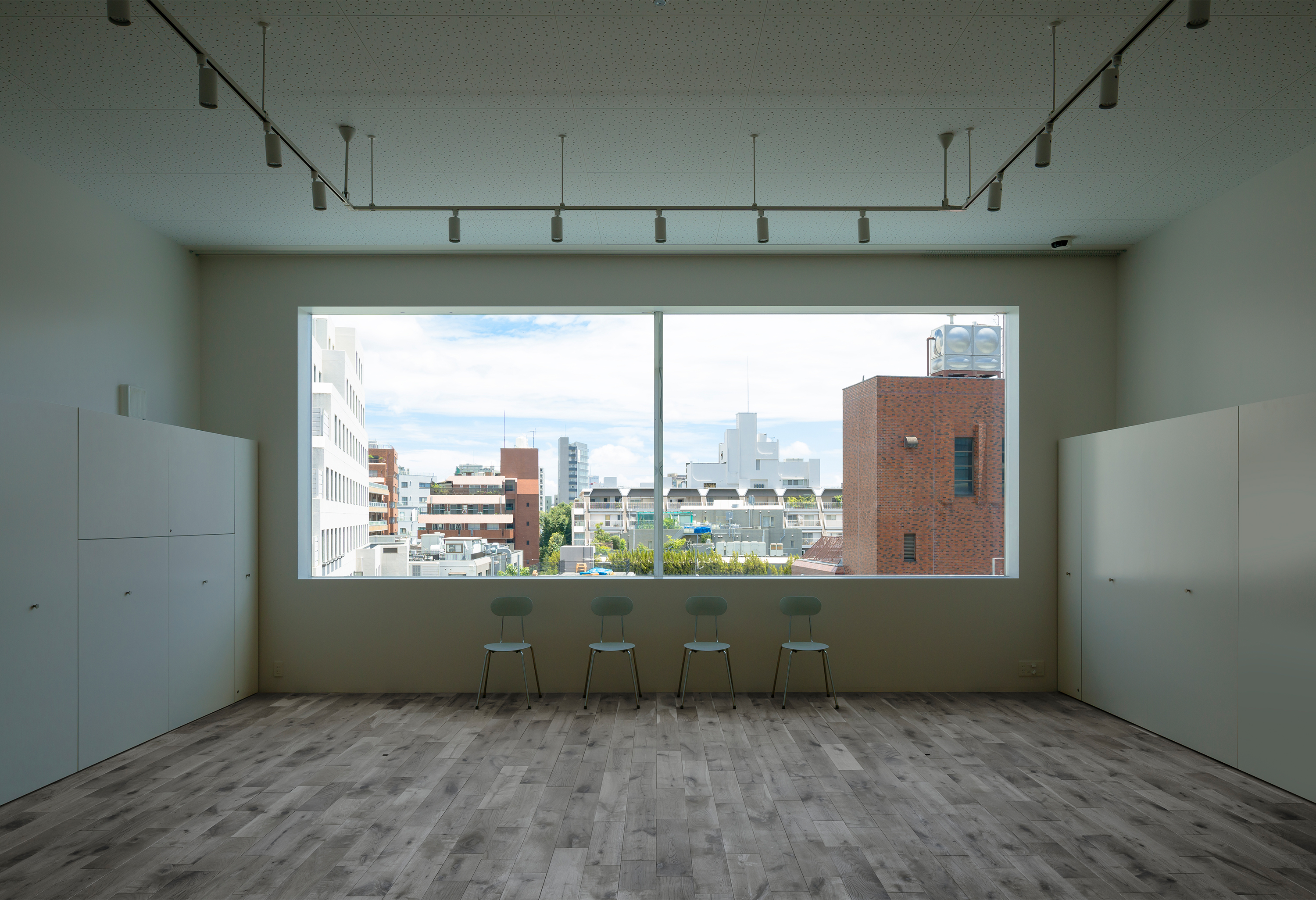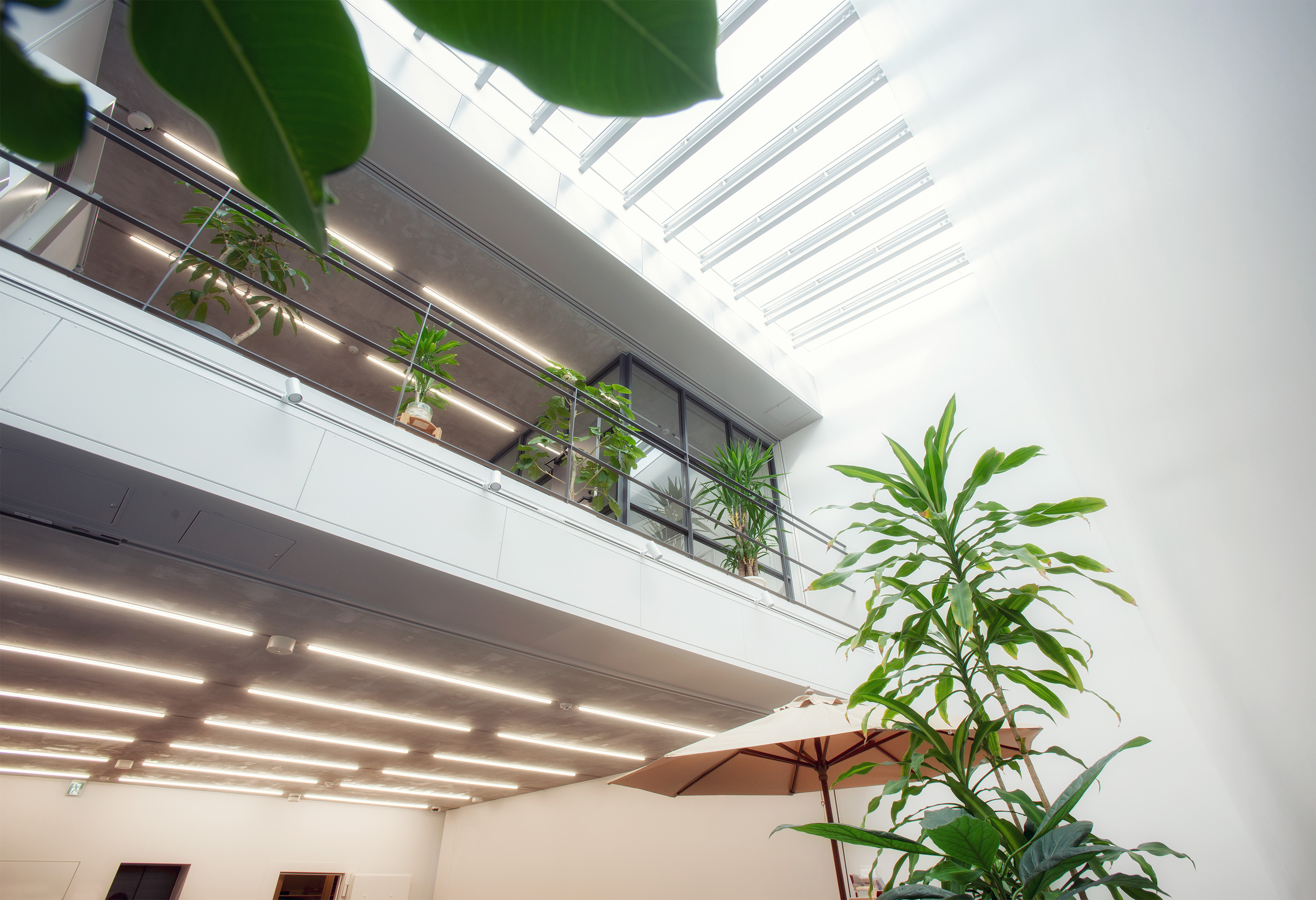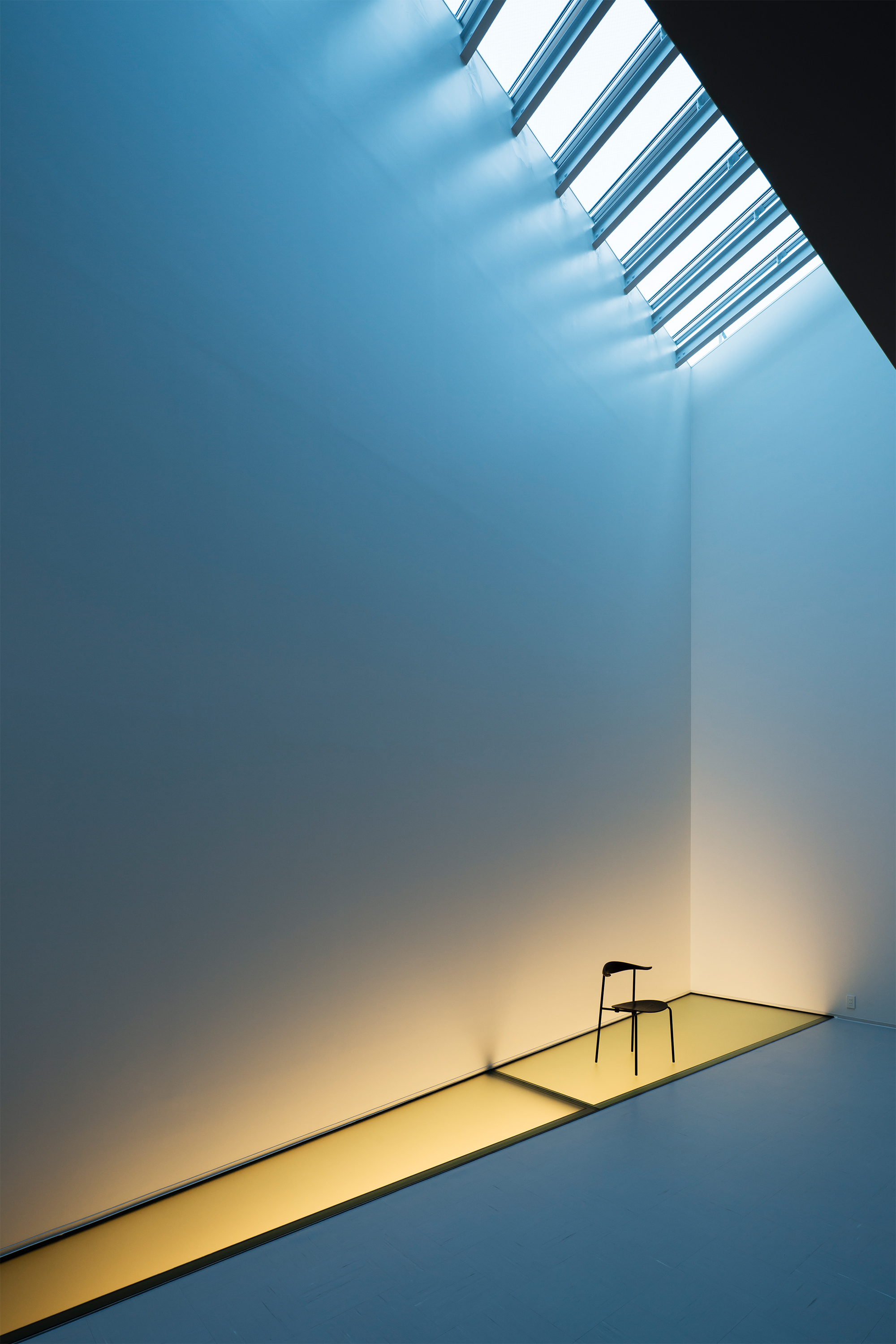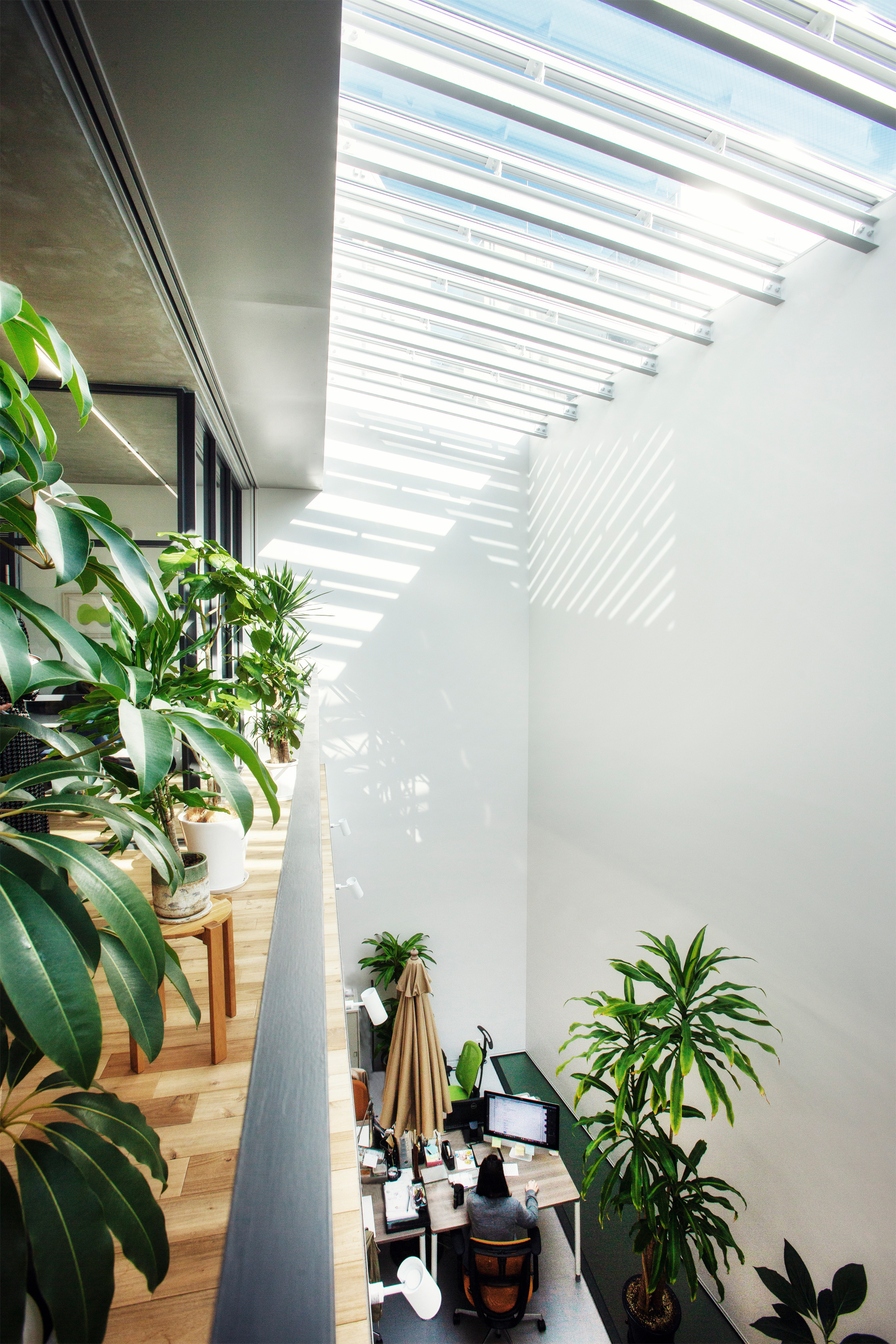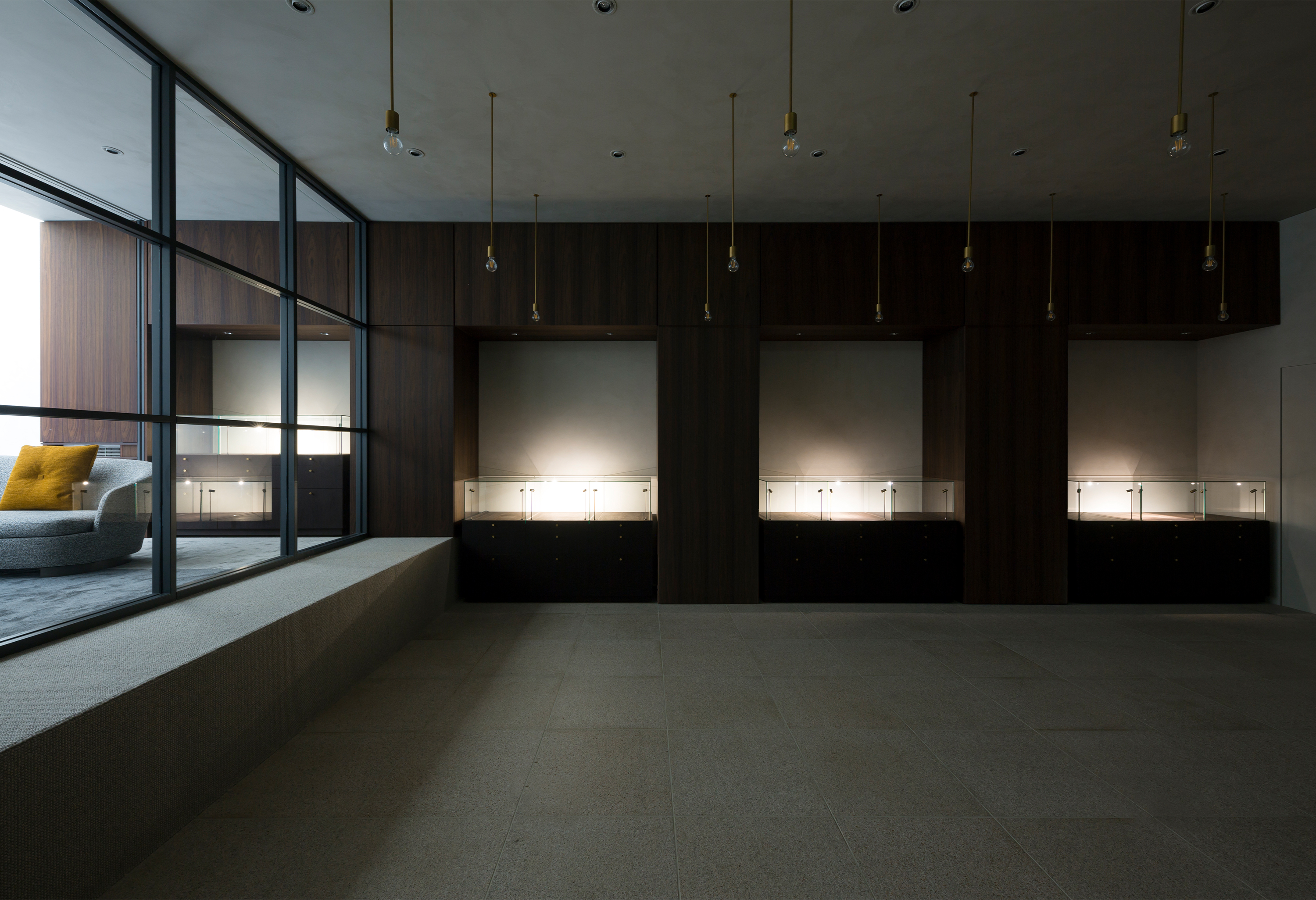 The room is lined with an array of luxurious materials and illuminated by both , the daylight, penetrating the building from above and a dimly lit grid off lights. Meanwhile the office above exudes a different character even though it shares the same light-well. The office has a simple, minimal interior and provides the staff with a bright working area, meeting spaces and an indoor balcony. The top floor continues the minimalistic theme set out in the office space and enriches it with a grand window, offering panoramic views for both executive meetings and staff workshops.The light-well offers the staff permanent access to daylight as opposed to the limited daylight timeframe of traditional horizontally orientated windows and office spaces.