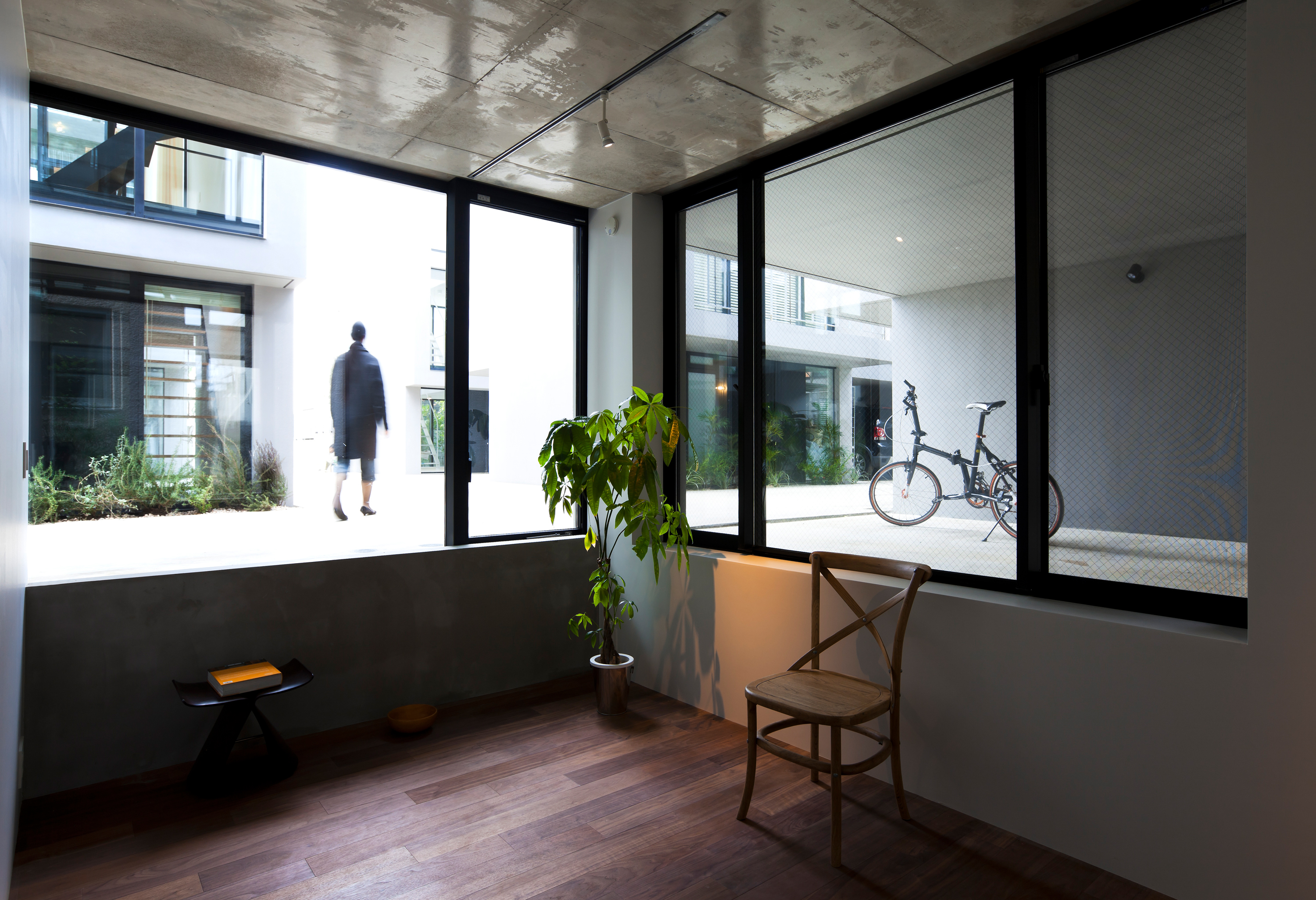 NOIE is a 11-unit cooperative development built as a series of terraced houses and is located in a quiet residential area in central Tokyo. The site itself is directly surrounded on all sides by other residences and can only be accessed through a 20m long public lined with trees and green.