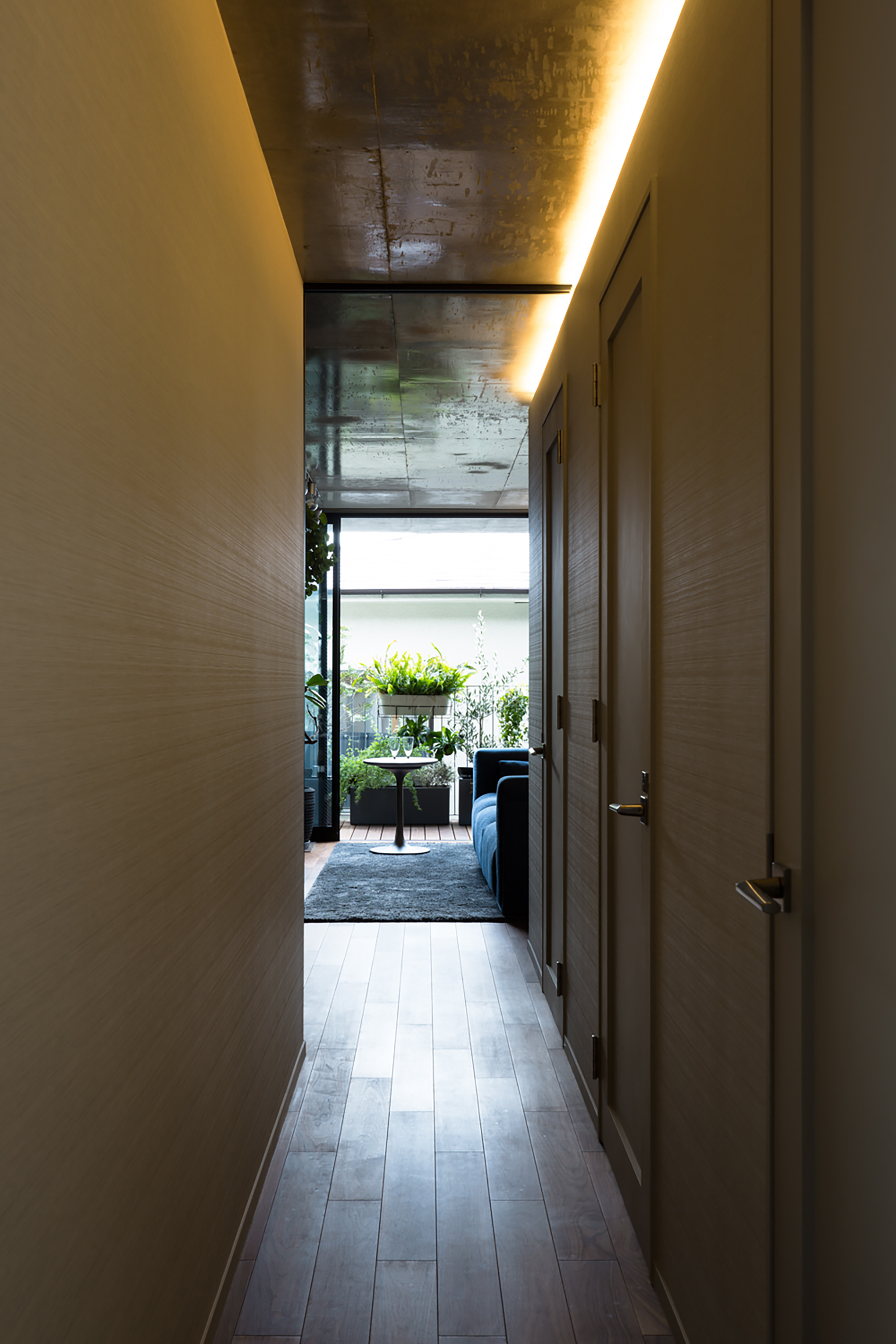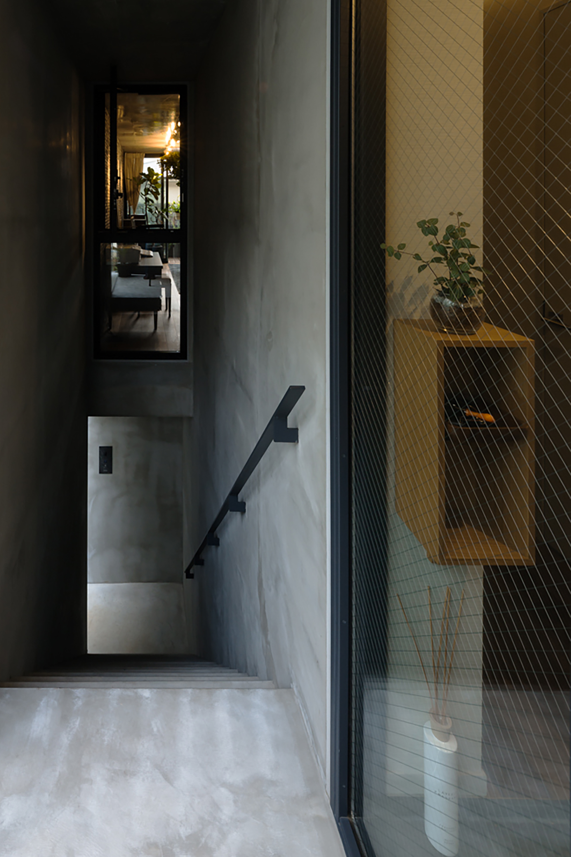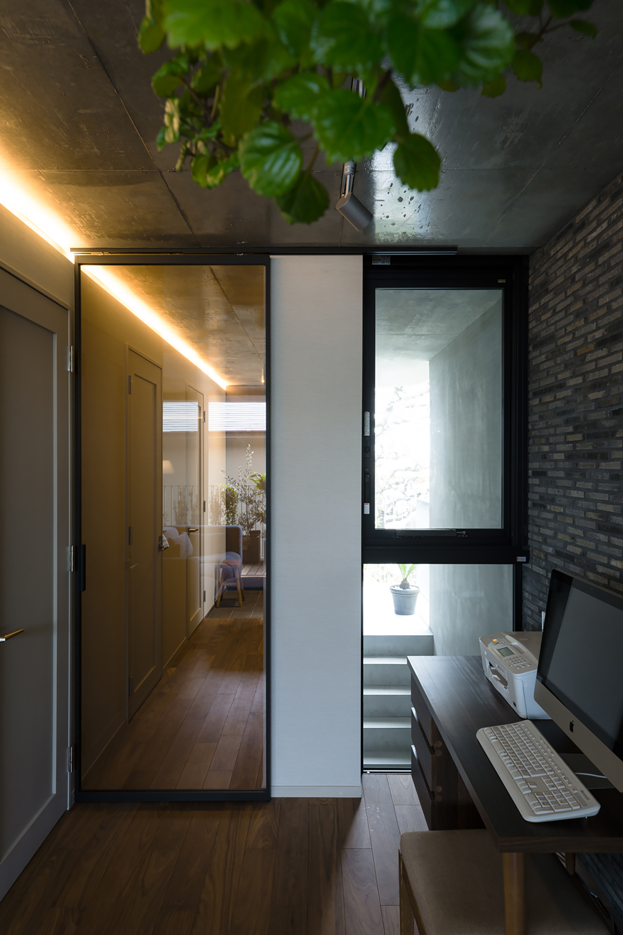 This is a cooperative apartment project with a total of 9 units, comprising 3 floors above ground and 1 basement floor. They are connected via large windows to a terrace dry area with a characteristic shape that takes advantage of the deformed site. All units are corner units with open-plan corner windows.