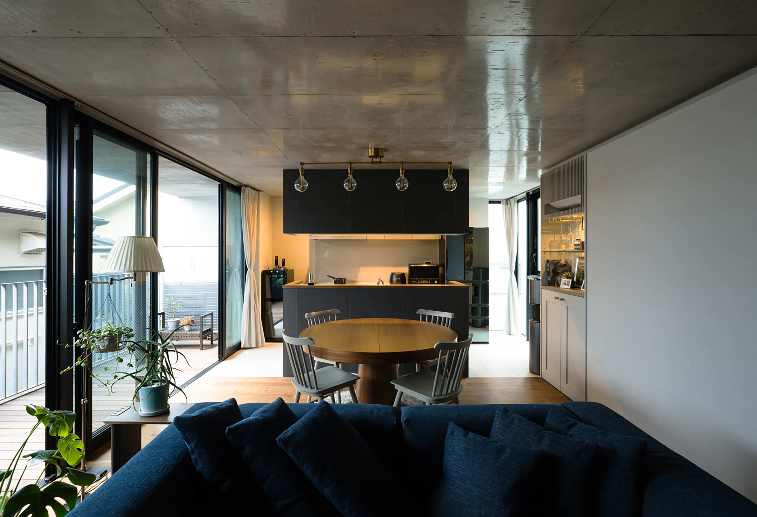 Unit B is a single floor apartment with a large terrace facing south-west side of the second floor. The living room, dining room and kitchen face this large opening, which connects the wooden flooring to the terrace and thus extends the space outward. The apartment is furthermore characterized by the two open corner windows on the north side.