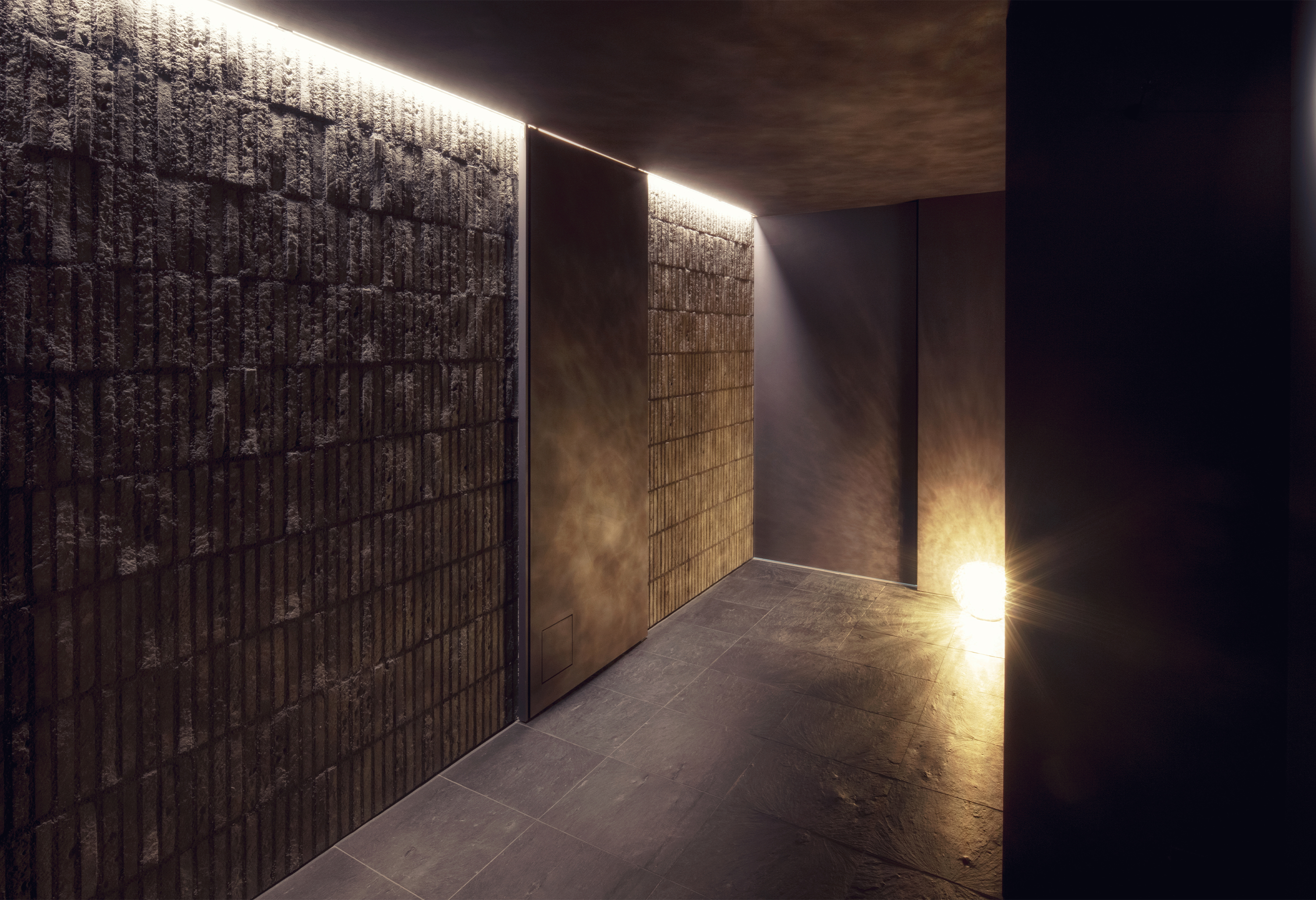 The finishes have been carefully selected in different rooms to create contrasts between materials and light and dark colors. In the bright living room, the floor and ceiling are made of beautifully grained oak, while the walls are painted with marble particles. The grey tones of the materials reflect the light and change their expression. To create a contrast between living space the materials and atmosphere are dark, sober tones. Thus, upon entering the main space the light and view are accentuated.