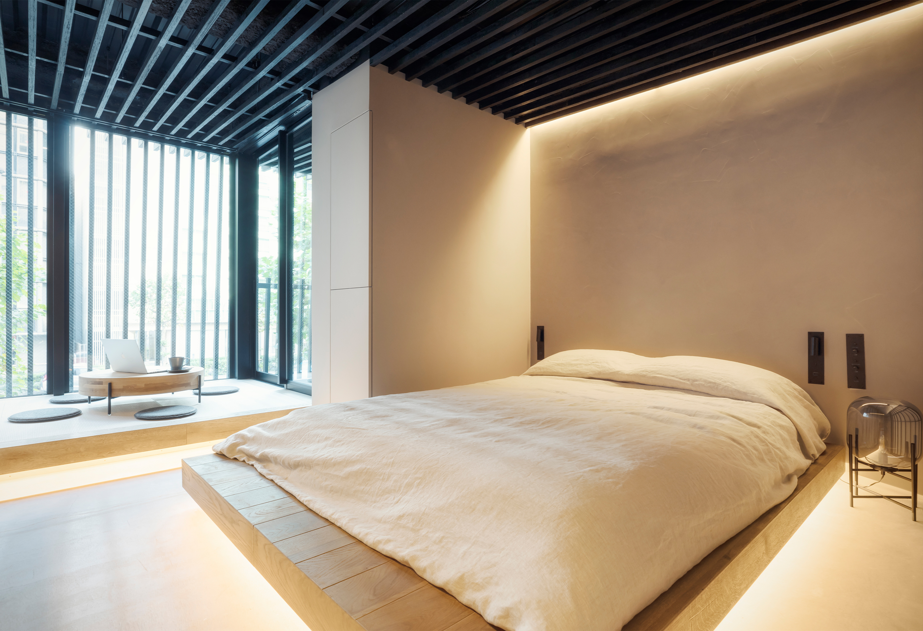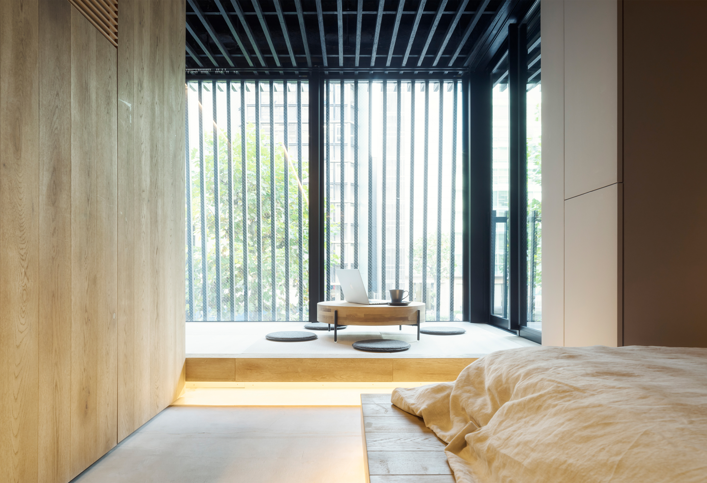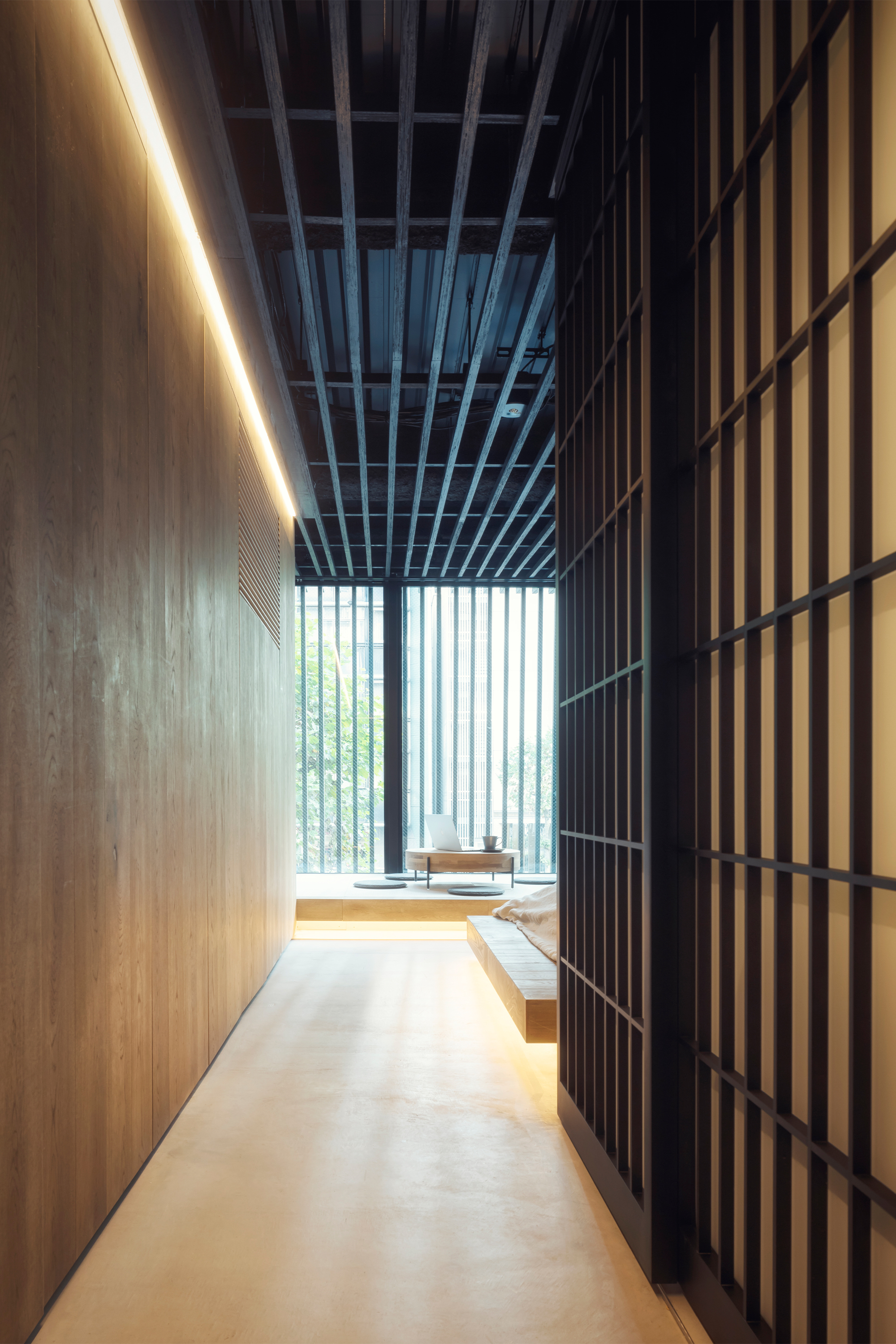 The facades are inspired by Japanese pagodas; creating a pattern of repetitive roofs stacked one above the other. The louvres that form these roofs offer privacy from passing traffic and connect the facade to the interior through their continuation in the ceiling.