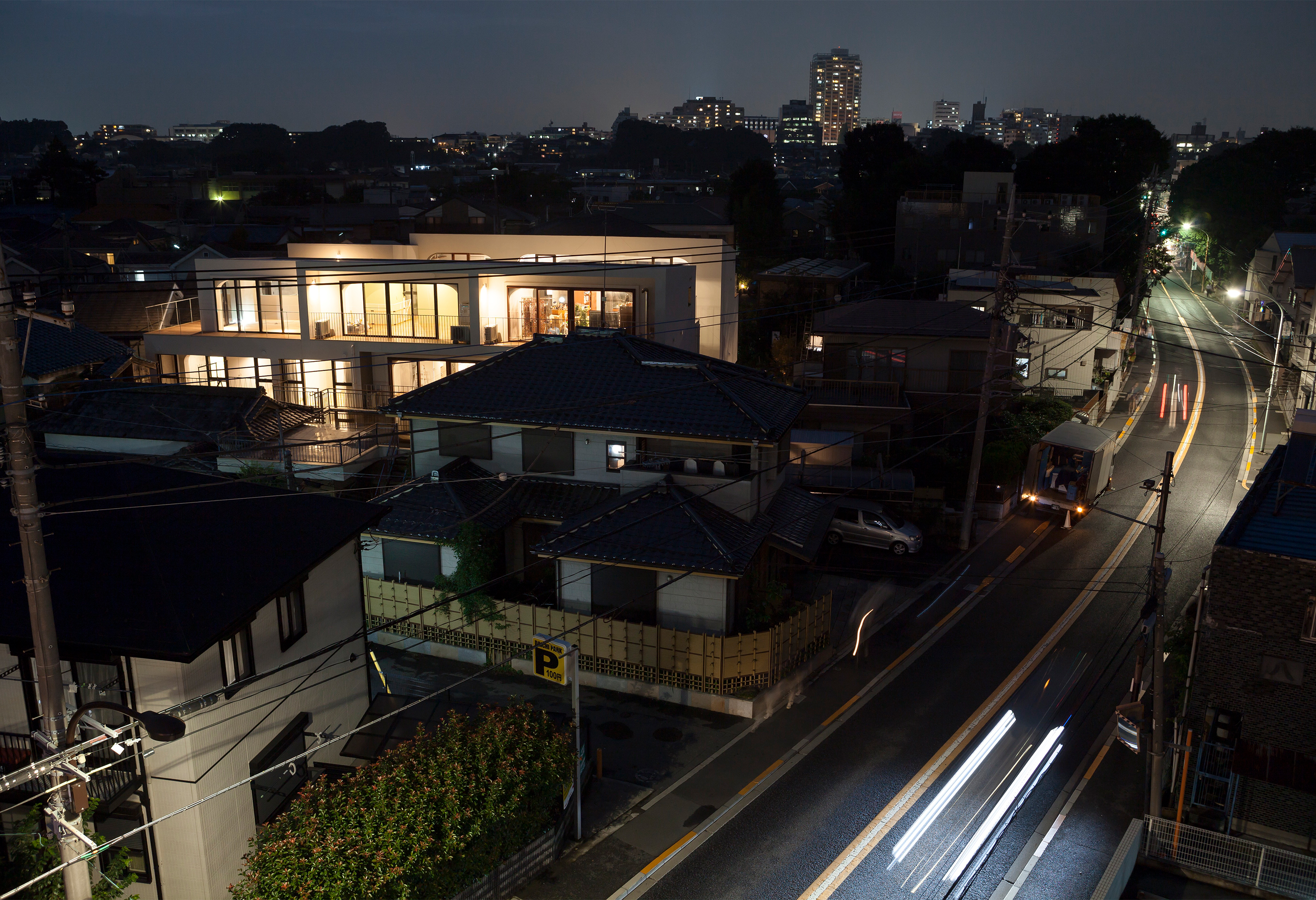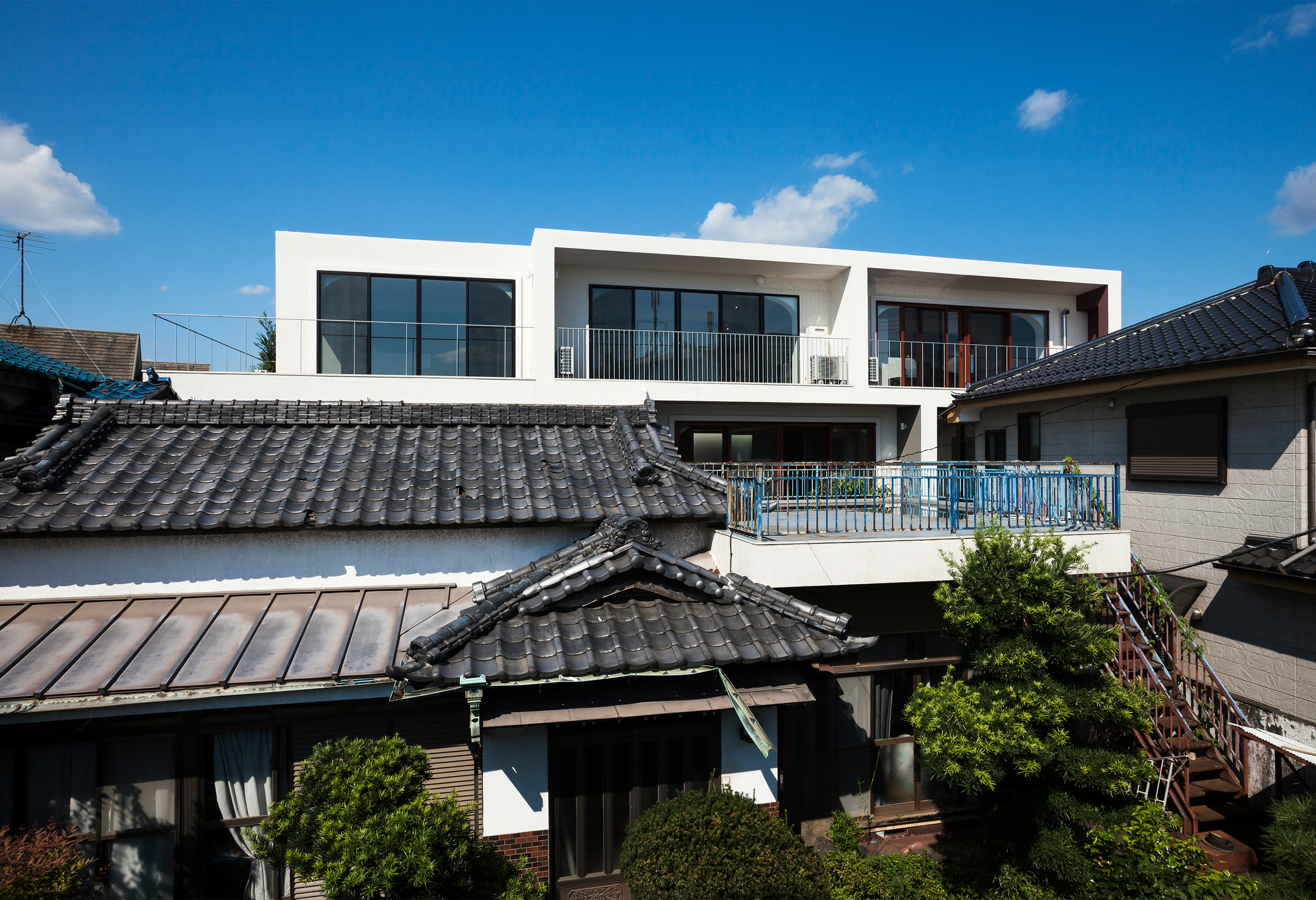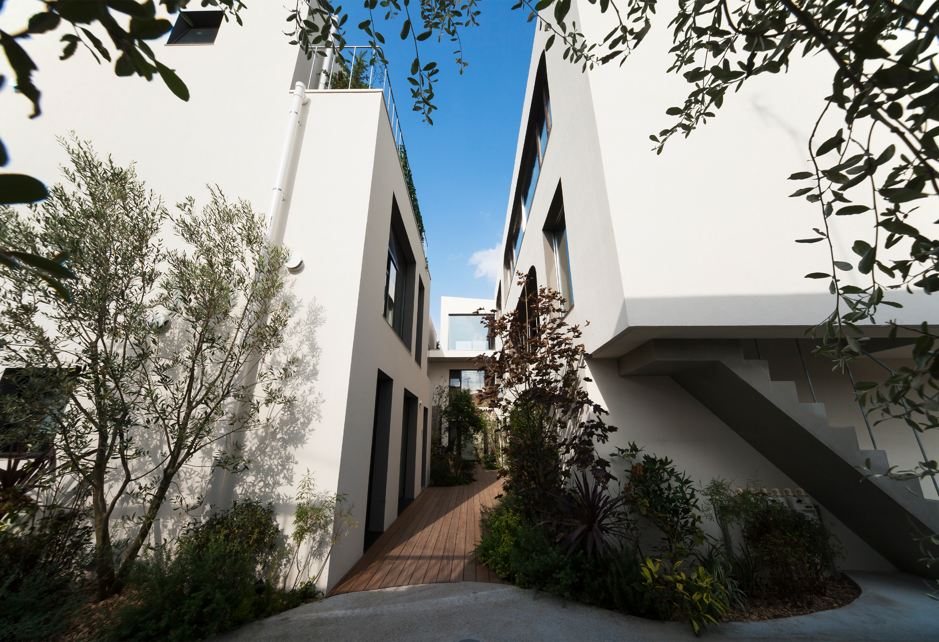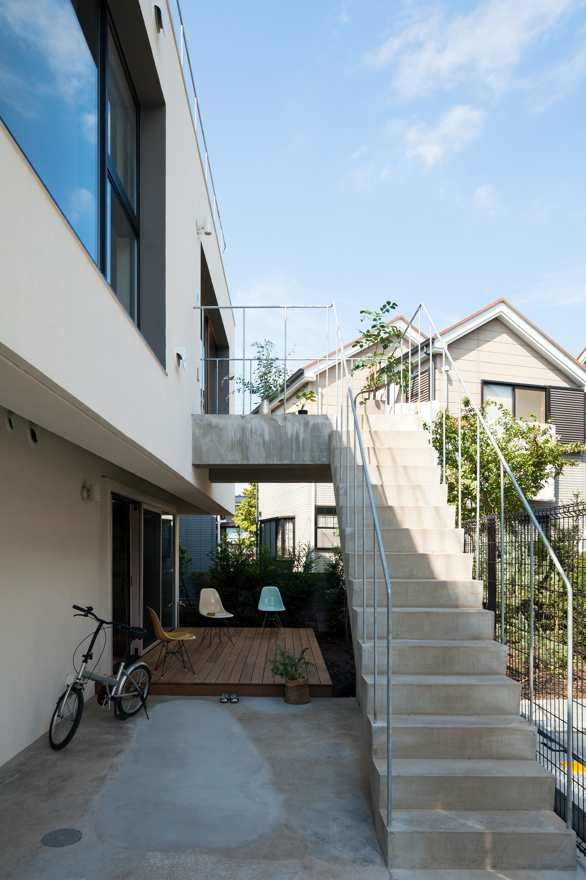 東京郊外のコの字型にウッドデッキの中庭を取り囲む、11住戸の長屋形式のコーポラティブハウスです。