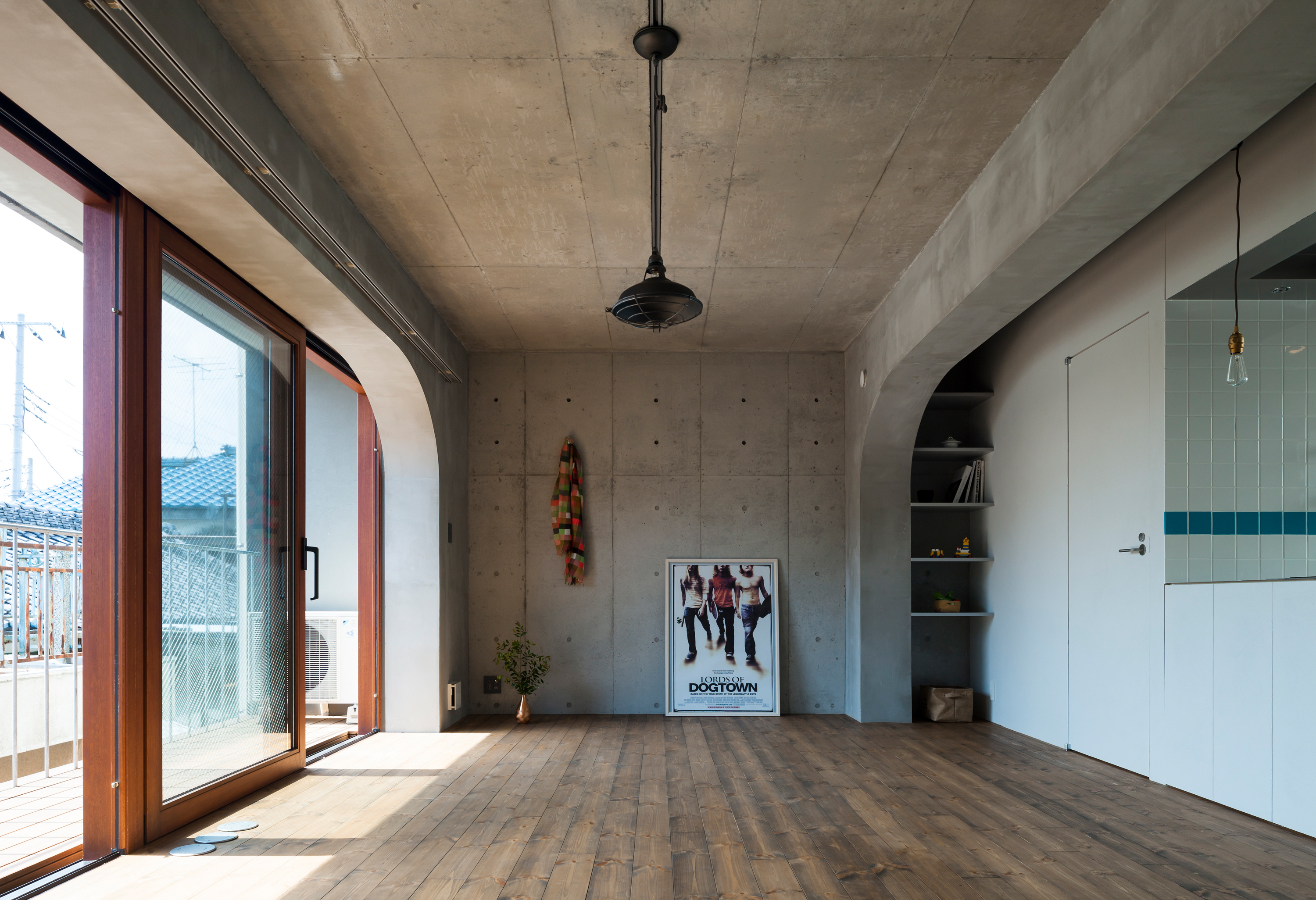 南側開口と豊かなテラスをテーマに、各住戸南向きの大間口の空間を持つよう住戸配置を行いました。面積等の諸条件から間口が各階ずれて重なるような断面形状とし、それを実現する構造形式としてアーチ型のコンクリート構造を採用しました。このアーチがファサードやインテリア空間を特徴づけ、建物のアクセントとなっています。
