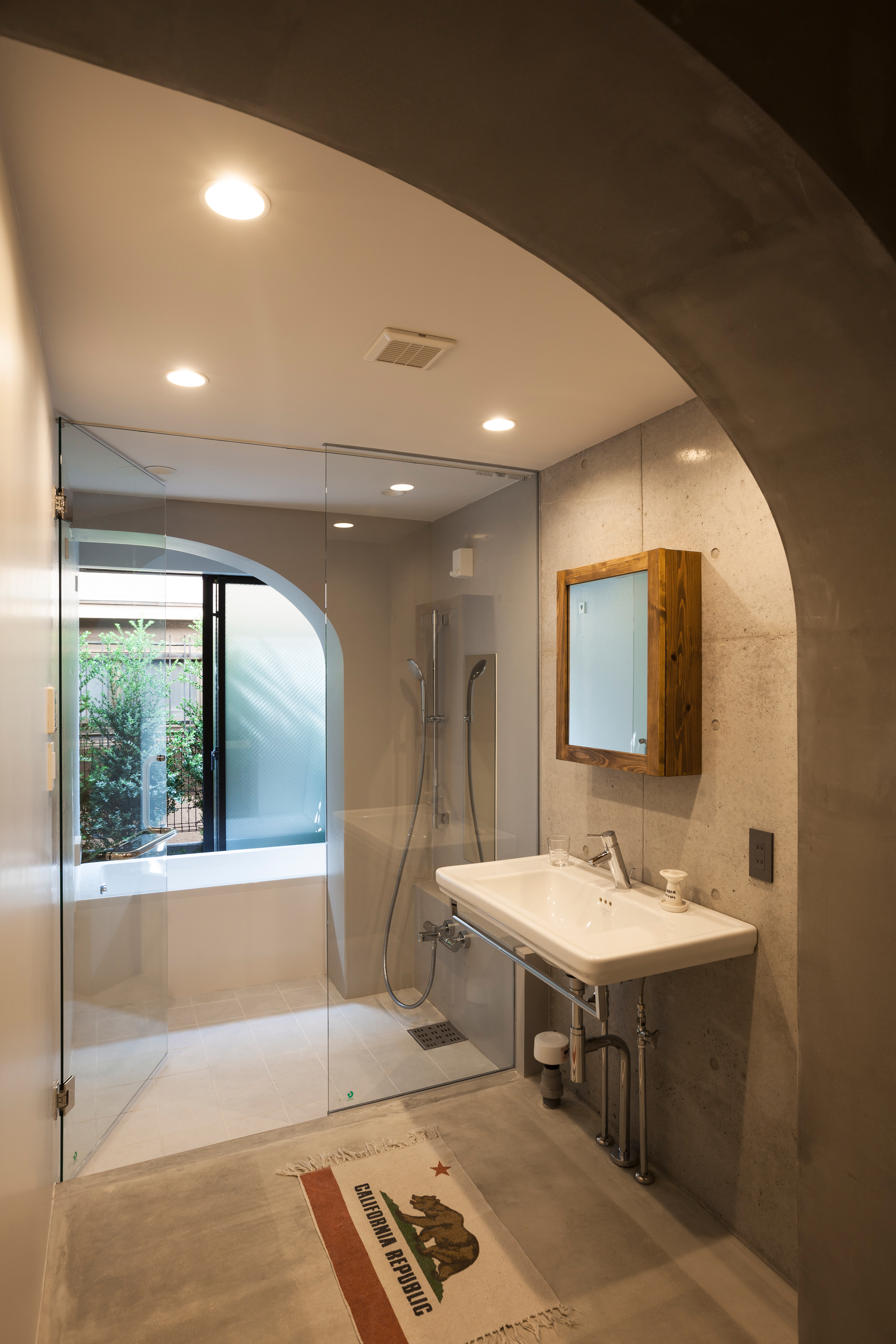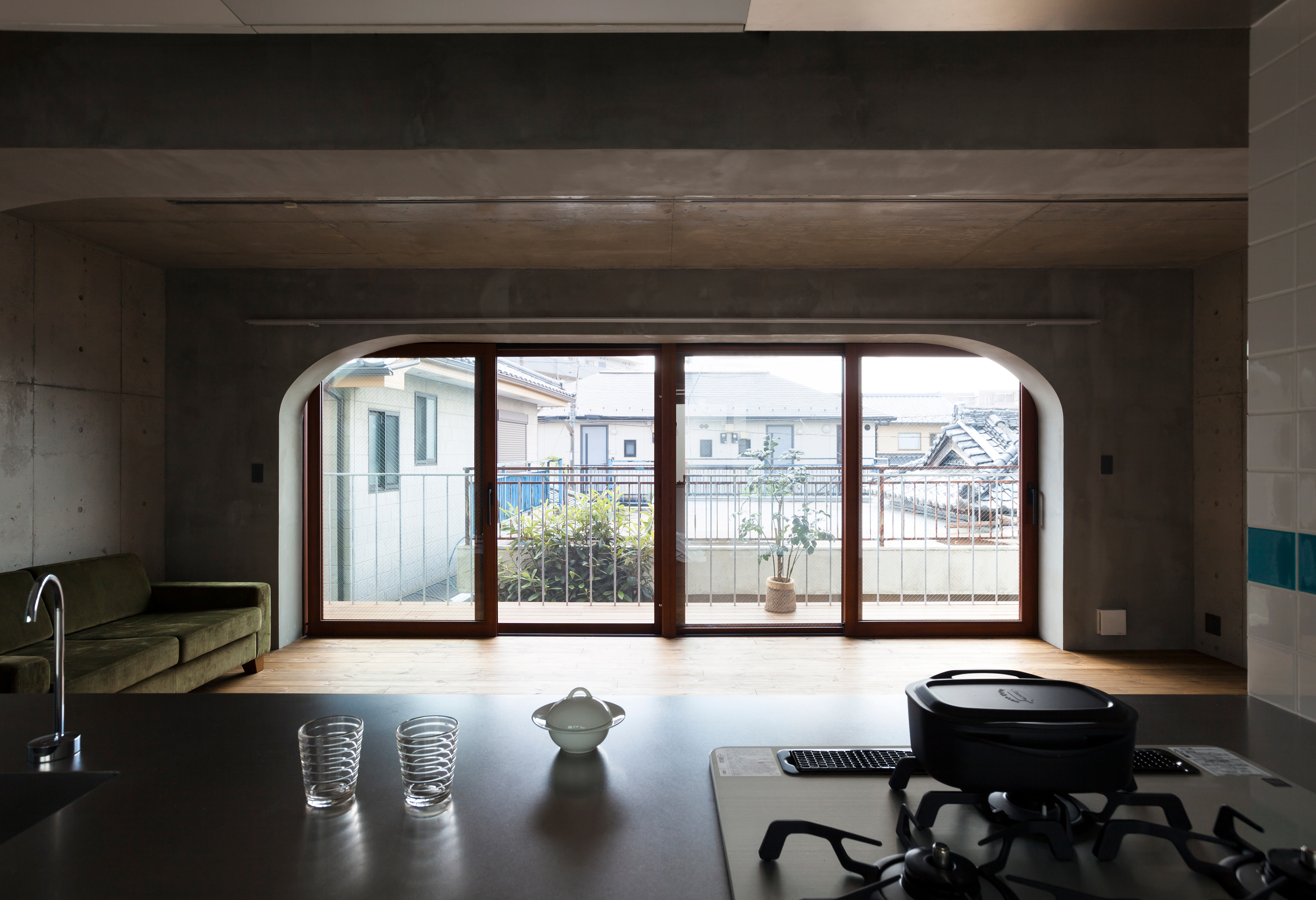 南側開口と豊かなテラスをテーマに、各住戸南向きの大間口の空間を持つよう住戸配置を行いました。面積等の諸条件から間口が各階ずれて重なるような断面形状とし、それを実現する構造形式としてアーチ型のコンクリート構造を採用しました。このアーチがファサードやインテリア空間を特徴づけ、建物のアクセントとなっています。