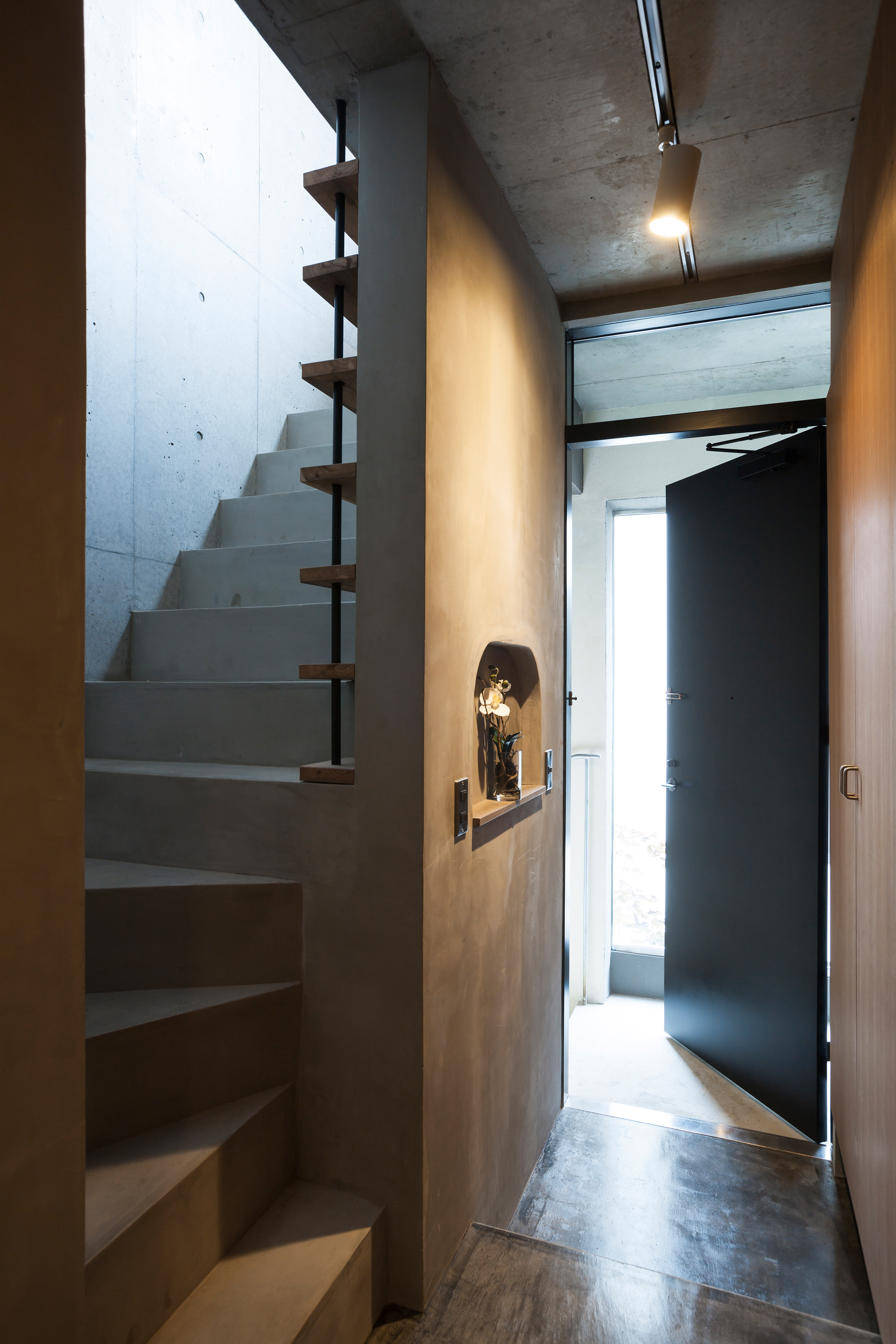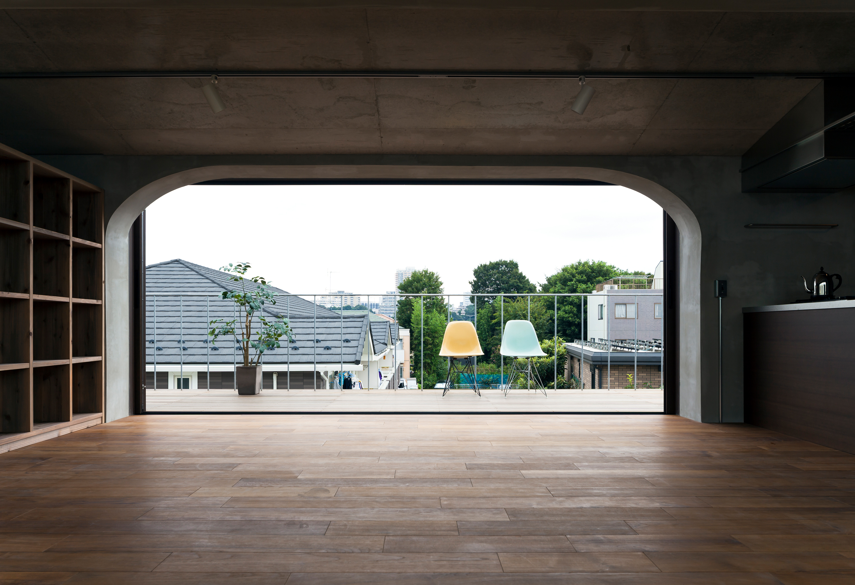 南側開口と豊かなテラスをテーマに、各住戸南向きの大間口の空間を持つよう住戸配置を行いました。面積等の諸条件から間口が各階ずれて重なるような断面形状とし、それを実現する構造形式としてアーチ型のコンクリート構造を採用しました。このアーチがファサードやインテリア空間を特徴づけ、建物のアクセントとなっています。