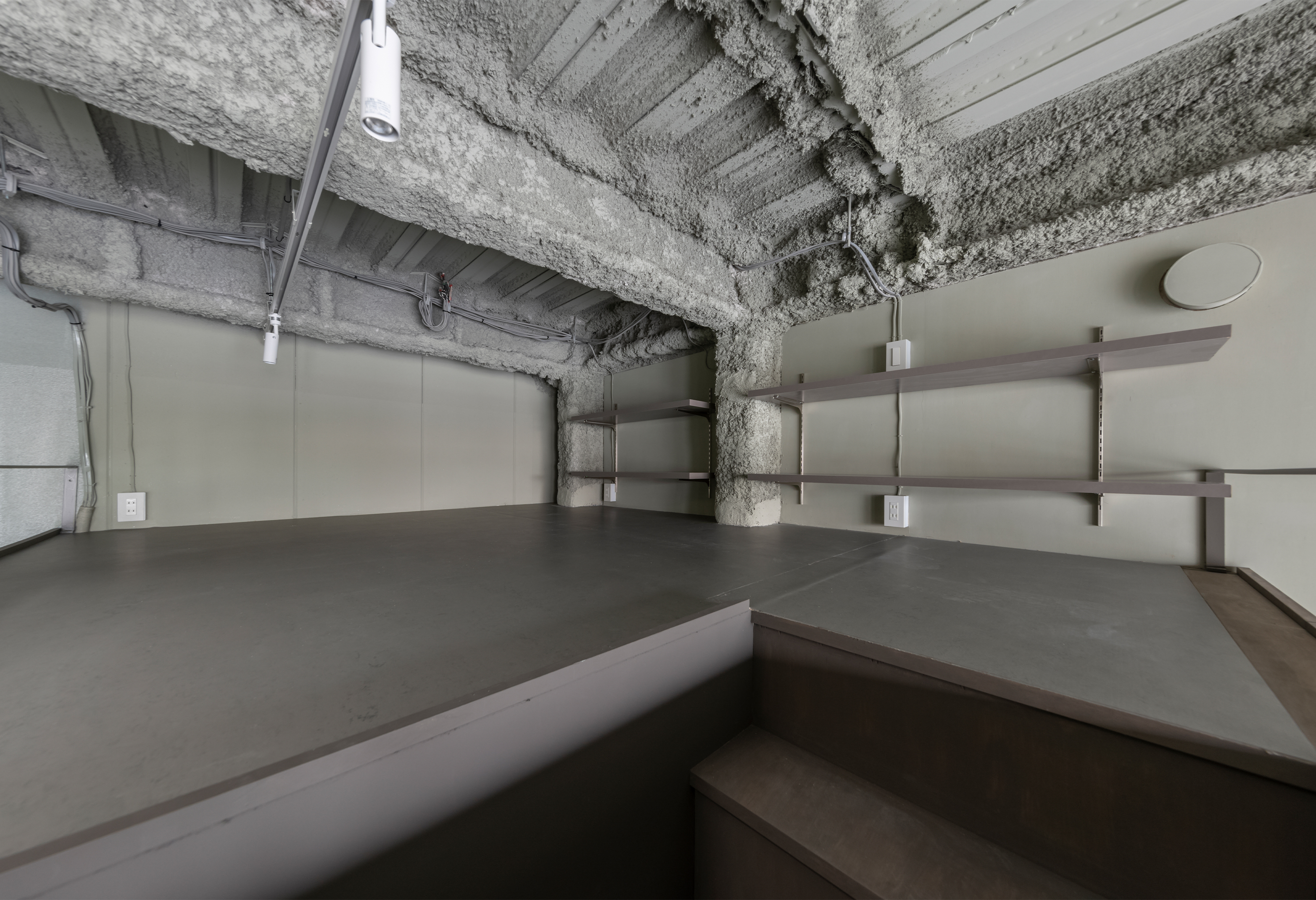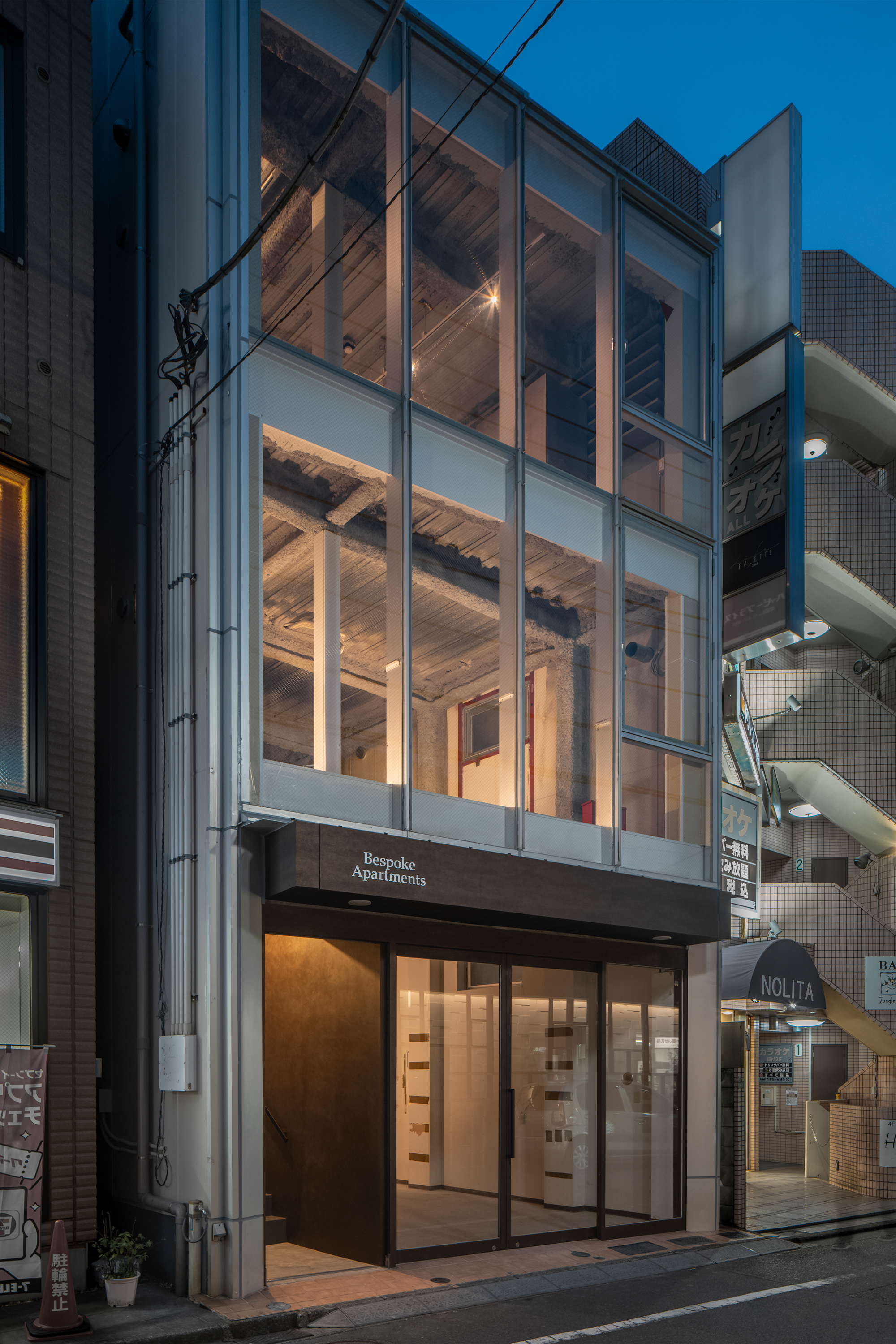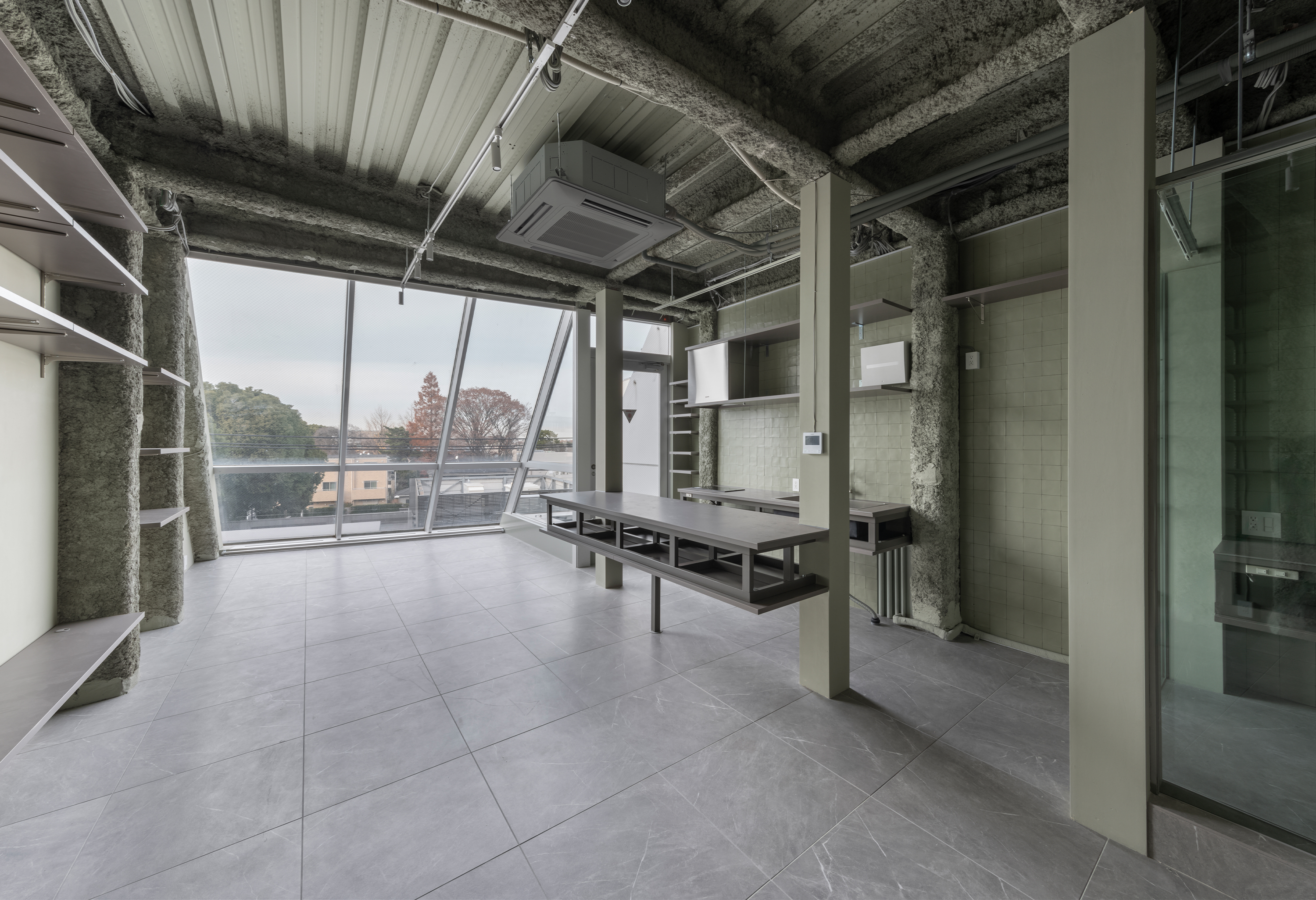 成城学園前駅前の商店街に位置する一棟貸しテナントビルを、各階別に貸し出す構成に変更し、1・2階をスケルトンのテナント貸し、3・4階をSOHO型住居としたリノベーションプロジェクトです。構造体を表しにしたダイナミックな構成とし、インダストリアルな雰囲気の空間かつ仕上の素材感や色使いにより成城らしい上品さを加えています。