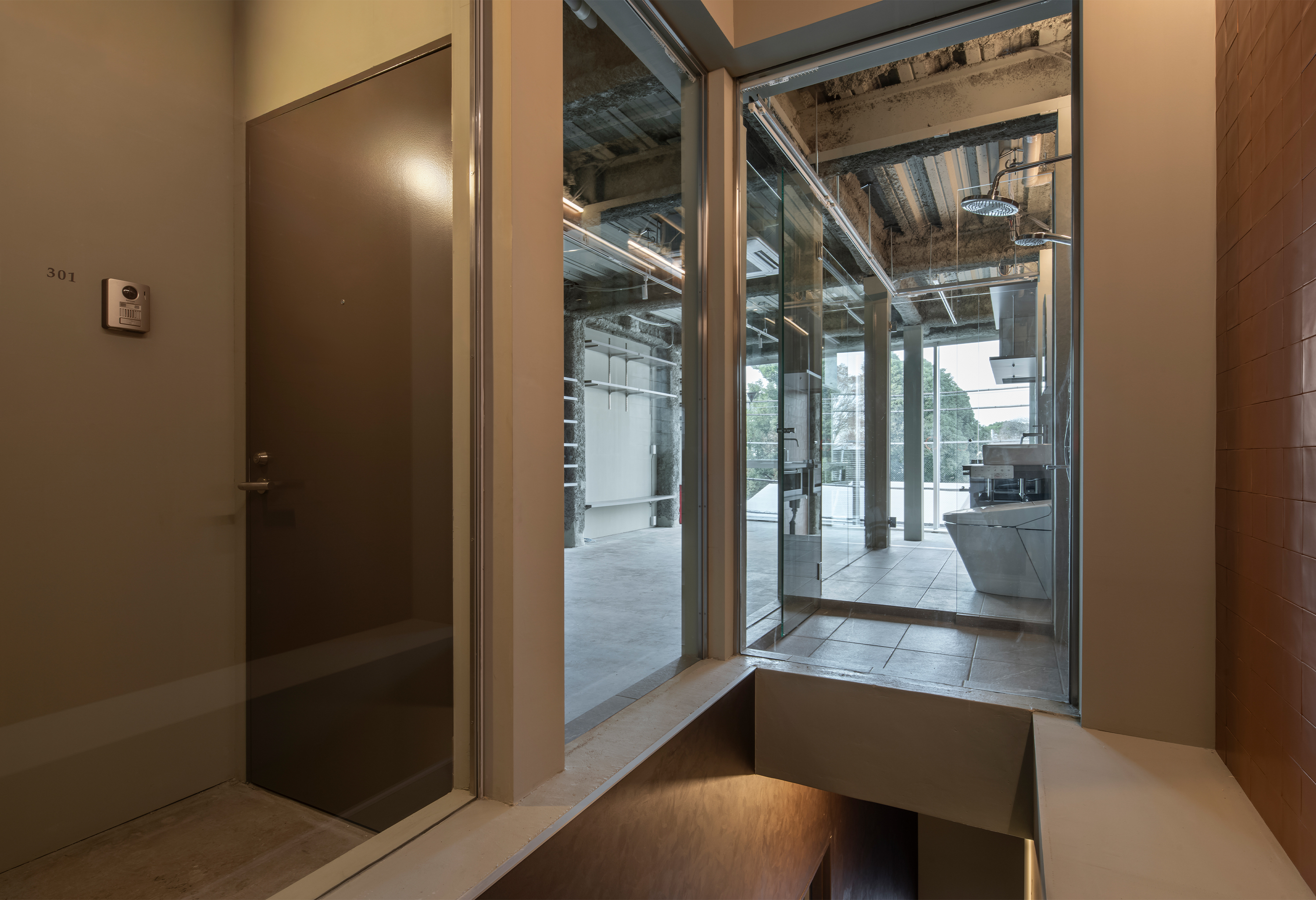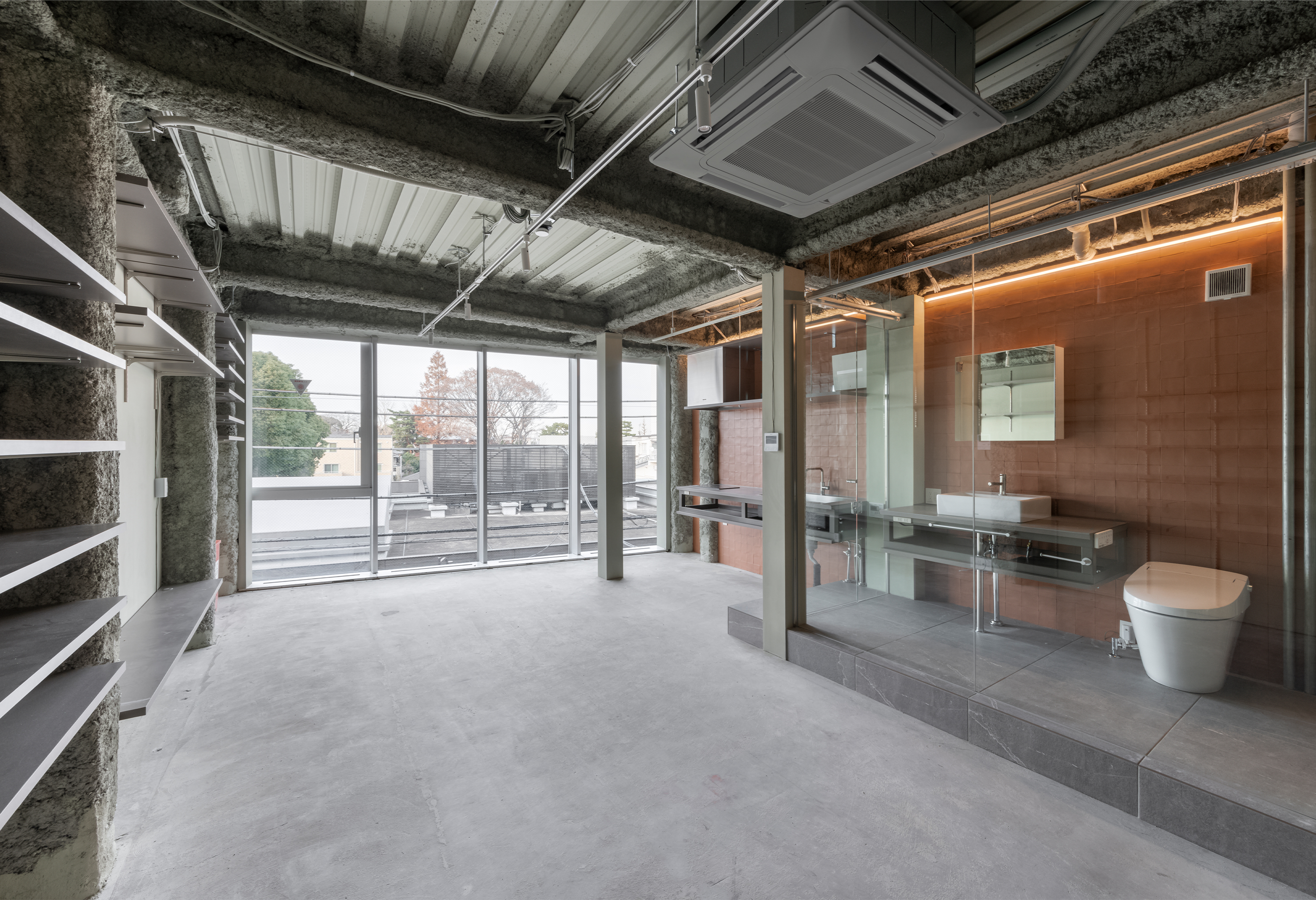 落ち着いたテラコッタ色の壁タイルが特徴的な3階は、できるだけオープンな空間を確保できるよう、キッチンや洗面台はコンパクトな壁付の仕様とし、床は既存のコンクリートの地をそのまま表し、カジュアルな雰囲気にまとめています。ローラー付きの可動収納により、入居者の好みに応じた場所で空間を区切って利用することができます。