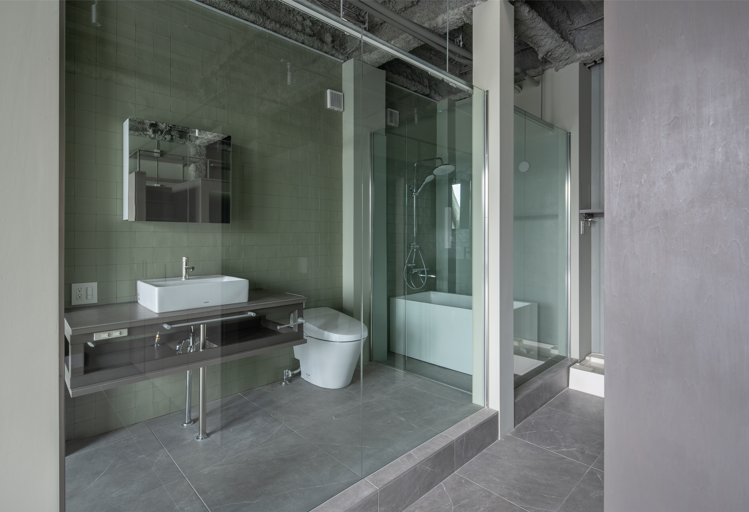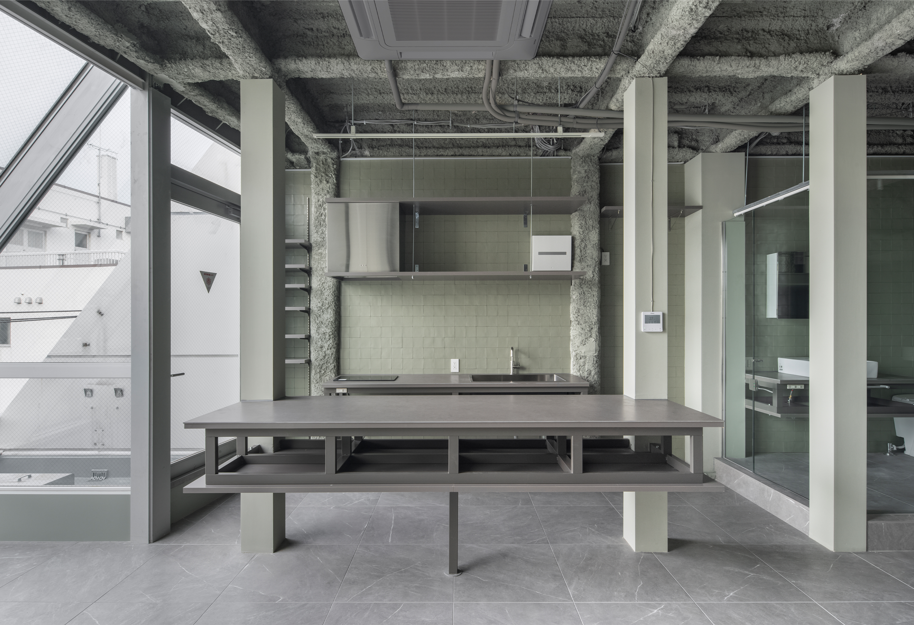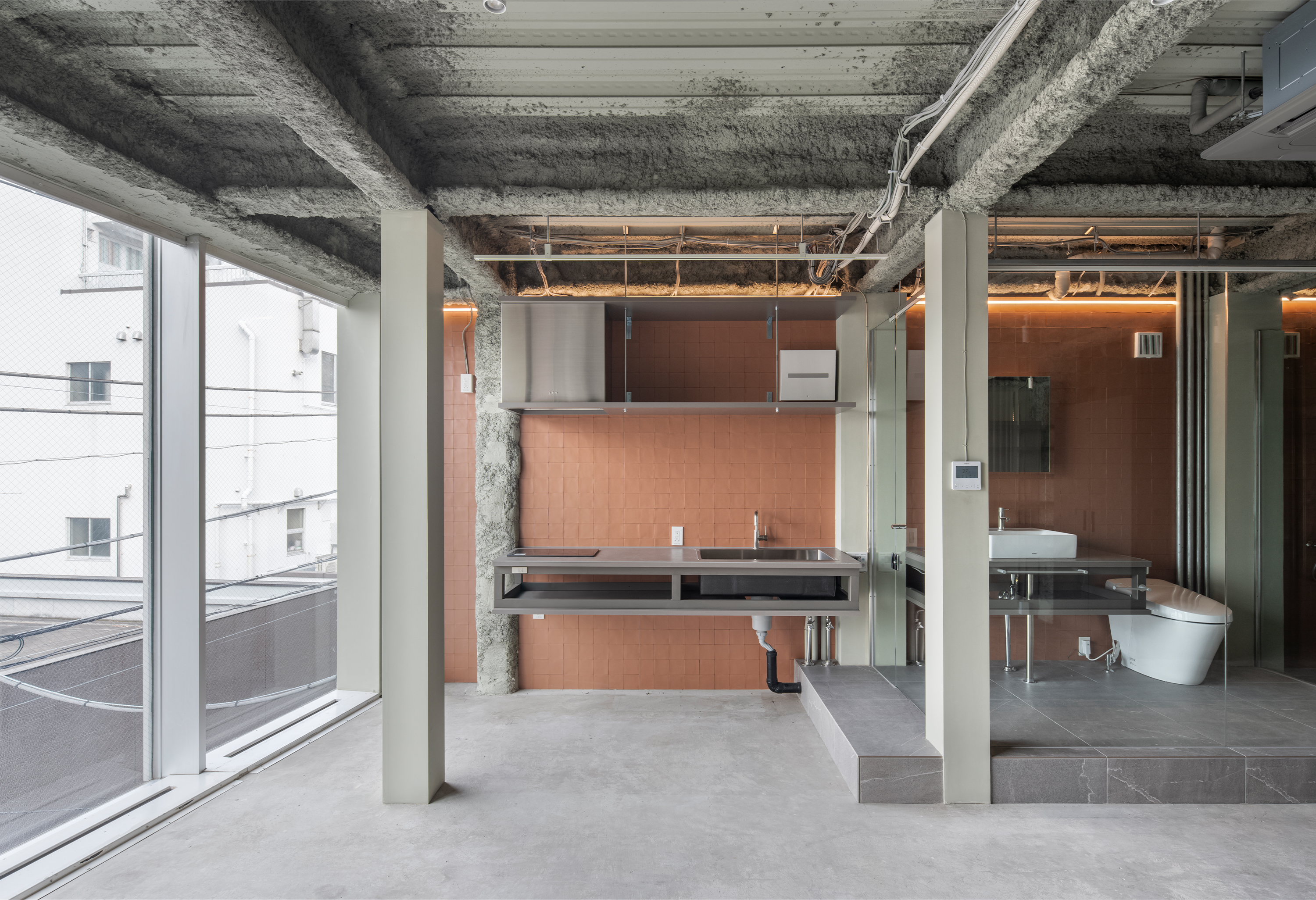 既存の耐火被覆や鉄骨躯体を表し、キッチンや洗面台も鉄骨で無骨に組立て、骨組みの力強い要素を生かしつつ、大判床タイルやセラミックカウンター、シンプルな設備機器等で上質さを付け加えています。空間を特徴づけるガラス張りの水廻りは、住戸全体に開放感を与えるとともに正面窓からの光を部屋の奥まで届けます。