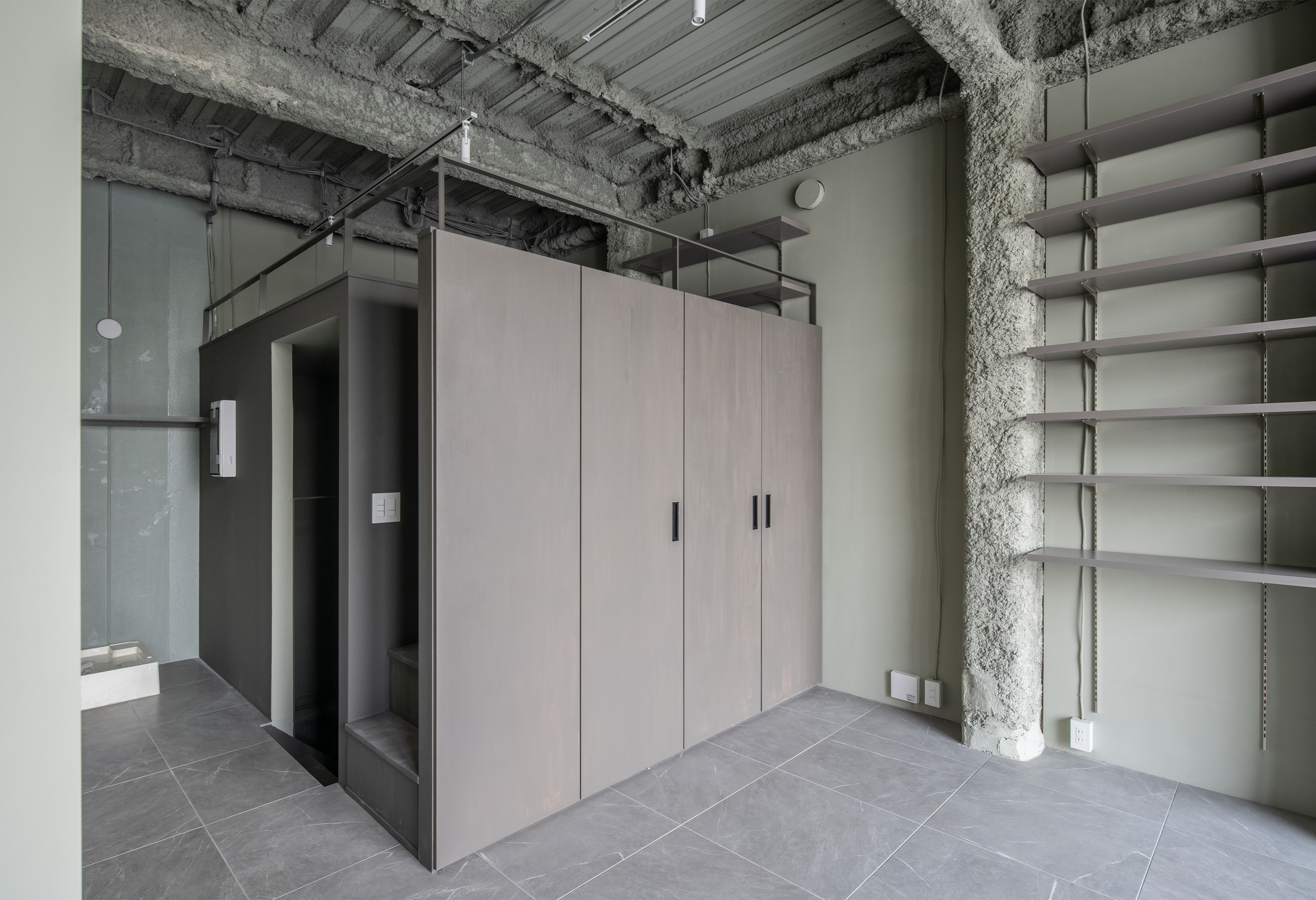 既存の建物は、新築当時の計画から階段の位置が変わっており一棟貸し仕様になっていましたが、その階段を新築当時の位置に戻し、通りから各階に個別にアクセス可能な形態に整えました。駅近であることから、3・4階は住居だけでなくSOHO的な利用も想定し、可動収納や可動棚により利用する形態によって自由にカスタマイズできるオープンな空間としています。